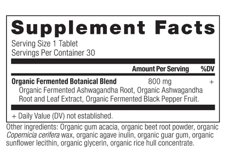 Organic Fermented Botanical Blend: Organic Fermented Ashwagandha Root, Organic Ashwagandha Root and Leaf Extract, Organic Fermented Black Pepper Fruit