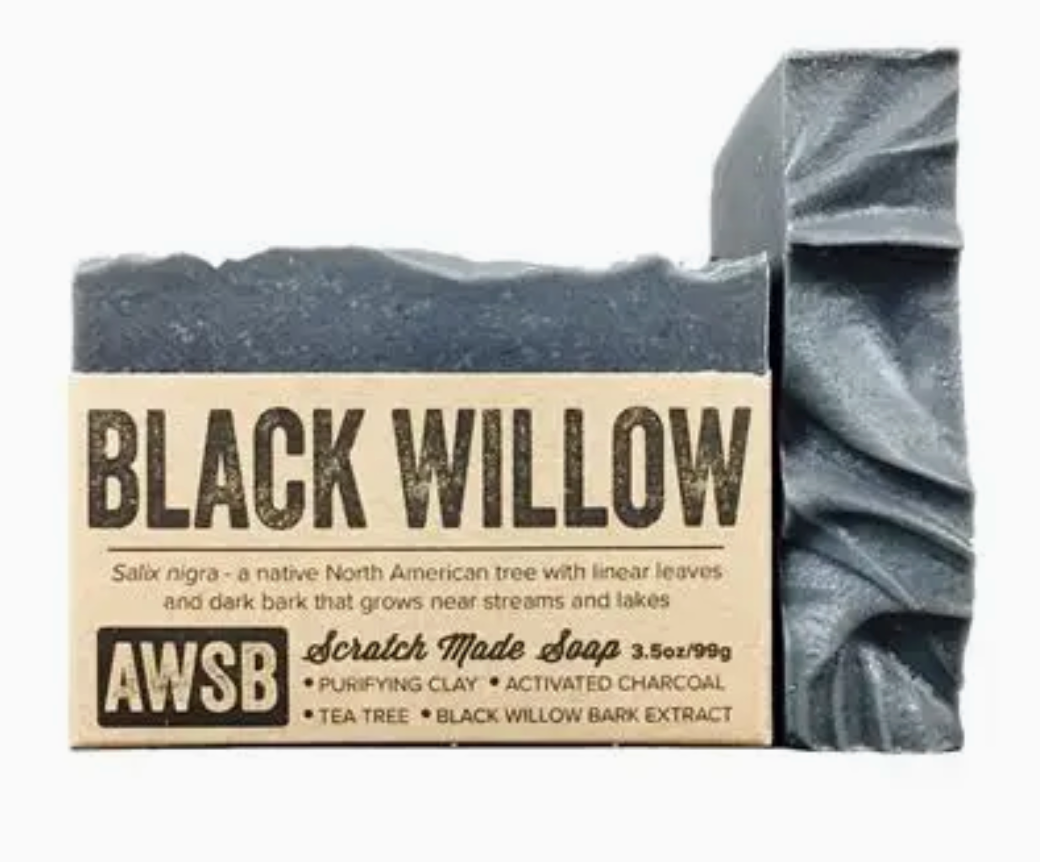 Kiembreek teeboom/bloekom essensiële olie versnit met suiwerende houtskool en swart wilger uittreksel vir aknee en velprobleme. 3,5 ons. bar seep, in doos.
