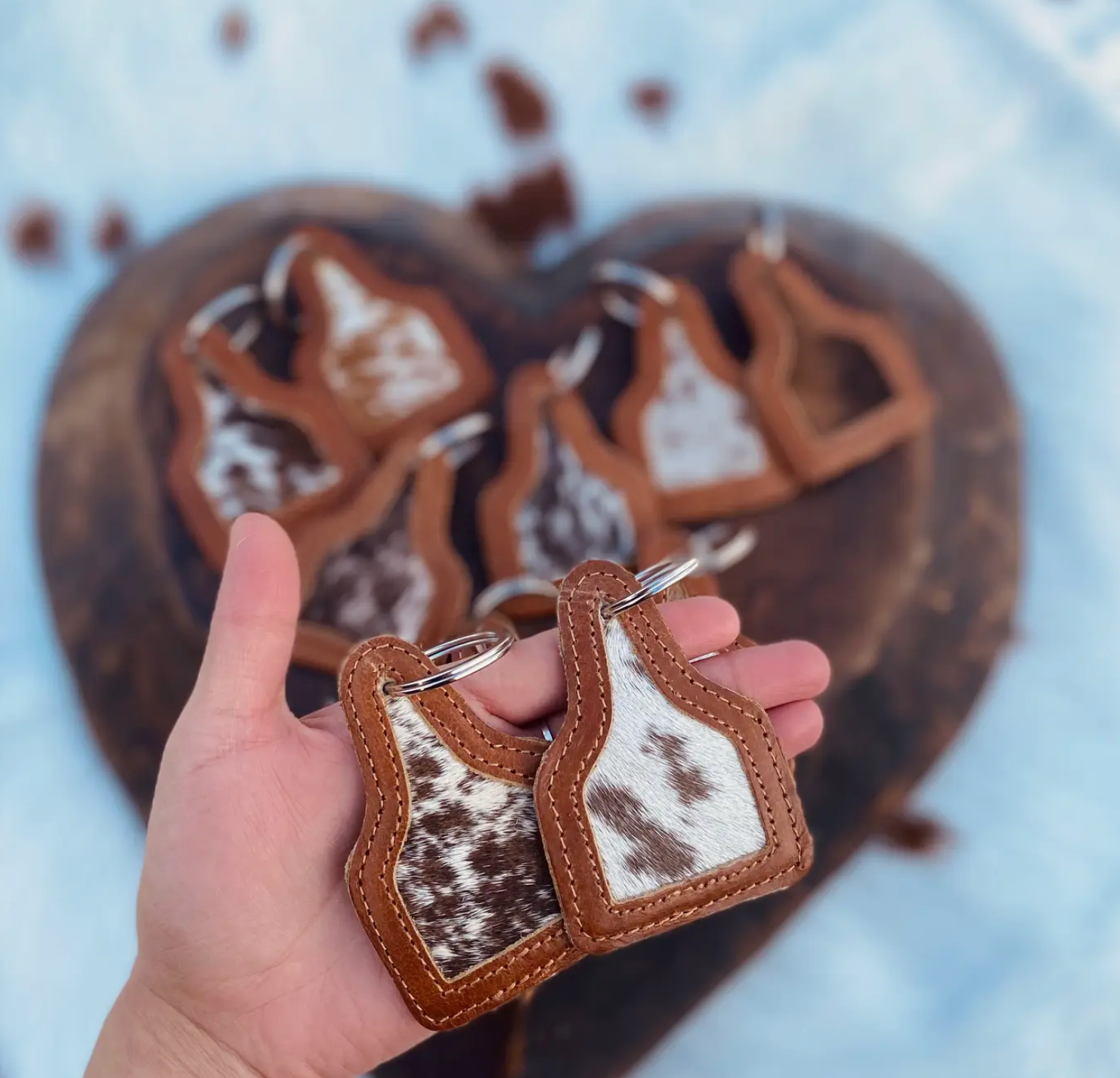 Ervaar die stylvolle en duursame beesvel-oorplaatjie-sleutelhanger. Elke unieke sleutelhanger is gemaak van regte hare op vel en het 'n stewige aanhegbare ring wat ongeveer 3x3". Staan uit met 'n unieke sleutelhanger, want elke beesvel spog met sy eie kenmerkende kleur. Perfek vir diereliefhebbers en mode-entoesiaste.