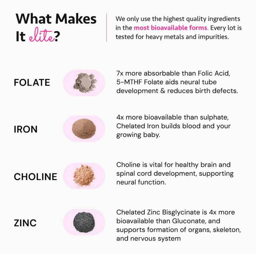 Elite Prenatal is gemaak van 26 noodsaaklike bestanddele wat bekend is om die gesondheid van binnekort moeders te ondersteun: