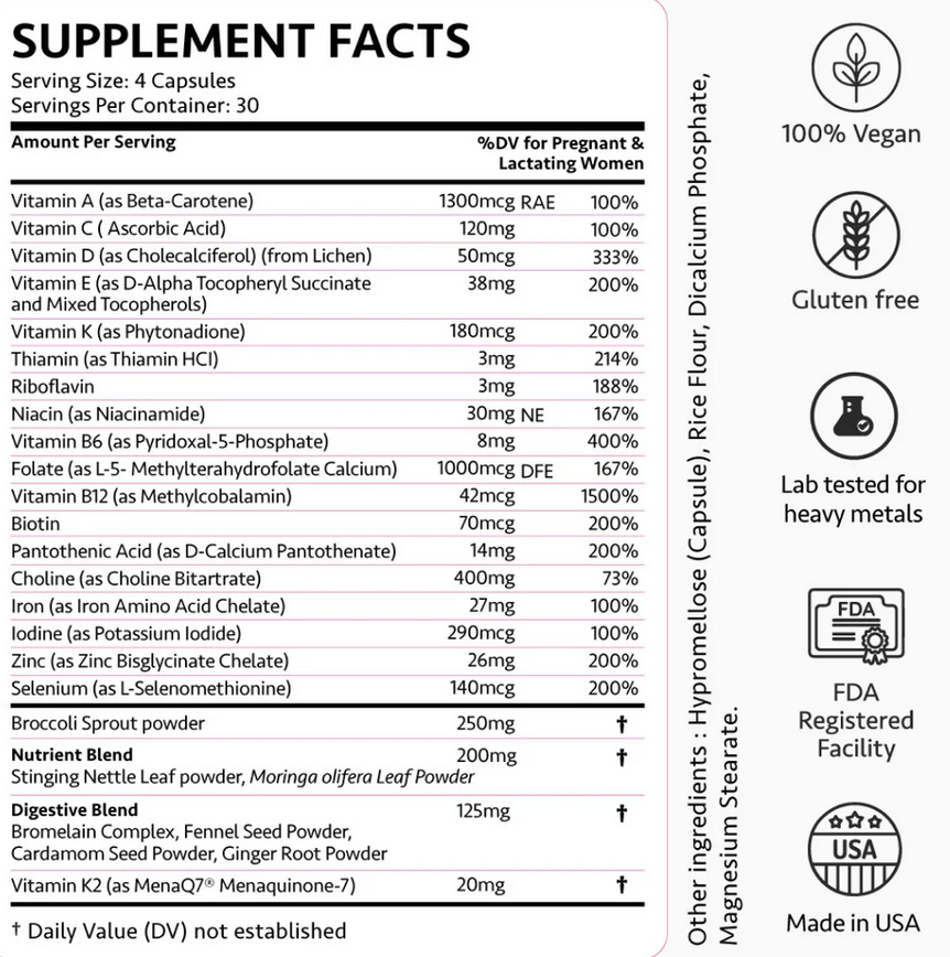 1. Uitgebreide voedingstofprofiel: Dit beskik oor 'n premium mengsel van 26 noodsaaklike vitamiene en plantaardige bestanddele , wat 'n wye verskeidenheid voedingstowwe verskaf wat beide moedergesondheid en fetale ontwikkeling ondersteun. Dit sluit kritieke komponente soos gemetieleerde folaat, cholien en jodium in, wat noodsaaklik is tydens swangerskap, maar baie voorgeboortelinge slaan oor.