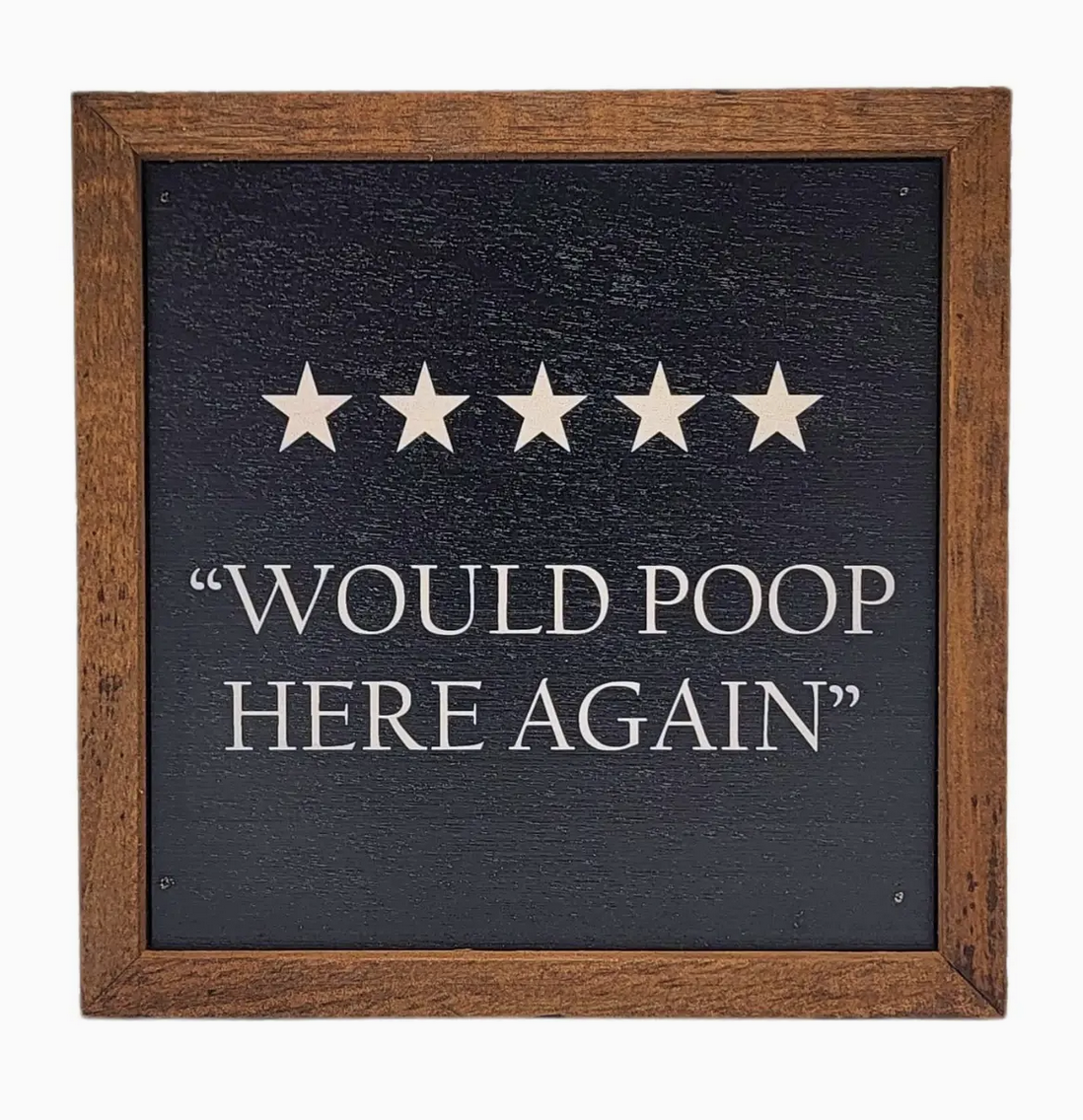 Sal Weer Hier Poep Snaakse Badkamer Teken. Al ons tekens is ingebou in 'n houtkasraam met 'n rustieke aanraking. Borde word direk van die raam af gehang of sal regop op 'n tafel of rak staan.