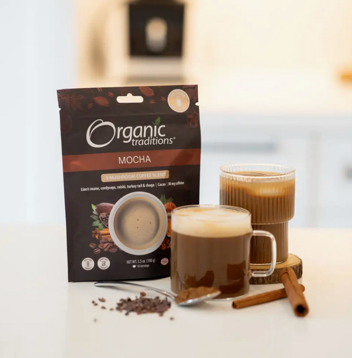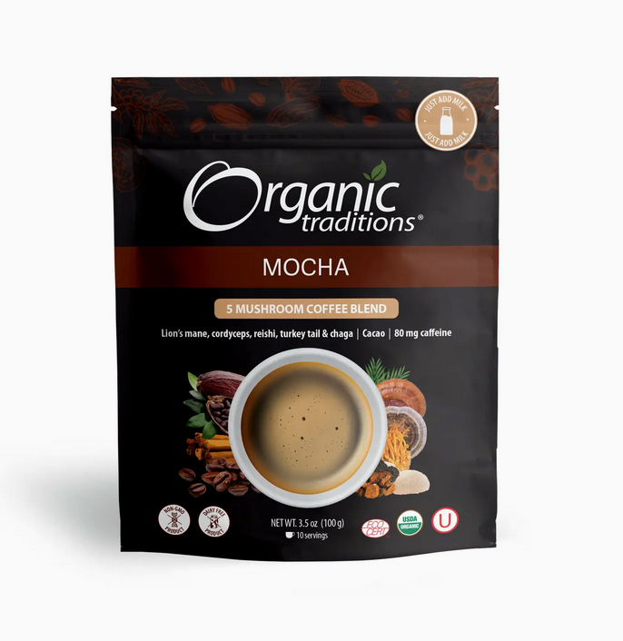 Ingredients: organic cacao powder, organic instant coffee, organic coconut palm sugar, organic 5 mushroom blend (chaga, cordyceps, lion's mane, reishi, turkey tail), organic monk fruit blend (monk fruit, erythritol), organic acacia fiber, organic cinnamon extract, organic vanilla flavor, sea salt.
