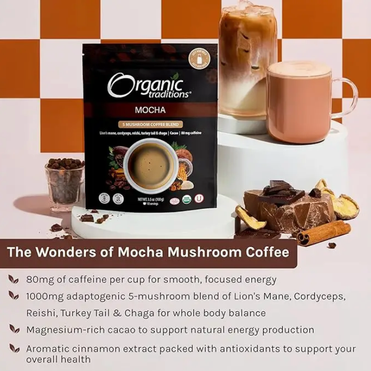 ☕Instant 5 Mushroom Coffee Blend made with a whole body harmonizing blend of chaga, cordyceps, reishi, lion's mane and turkey tail with organic instant coffee and magnesium rich cacao powder