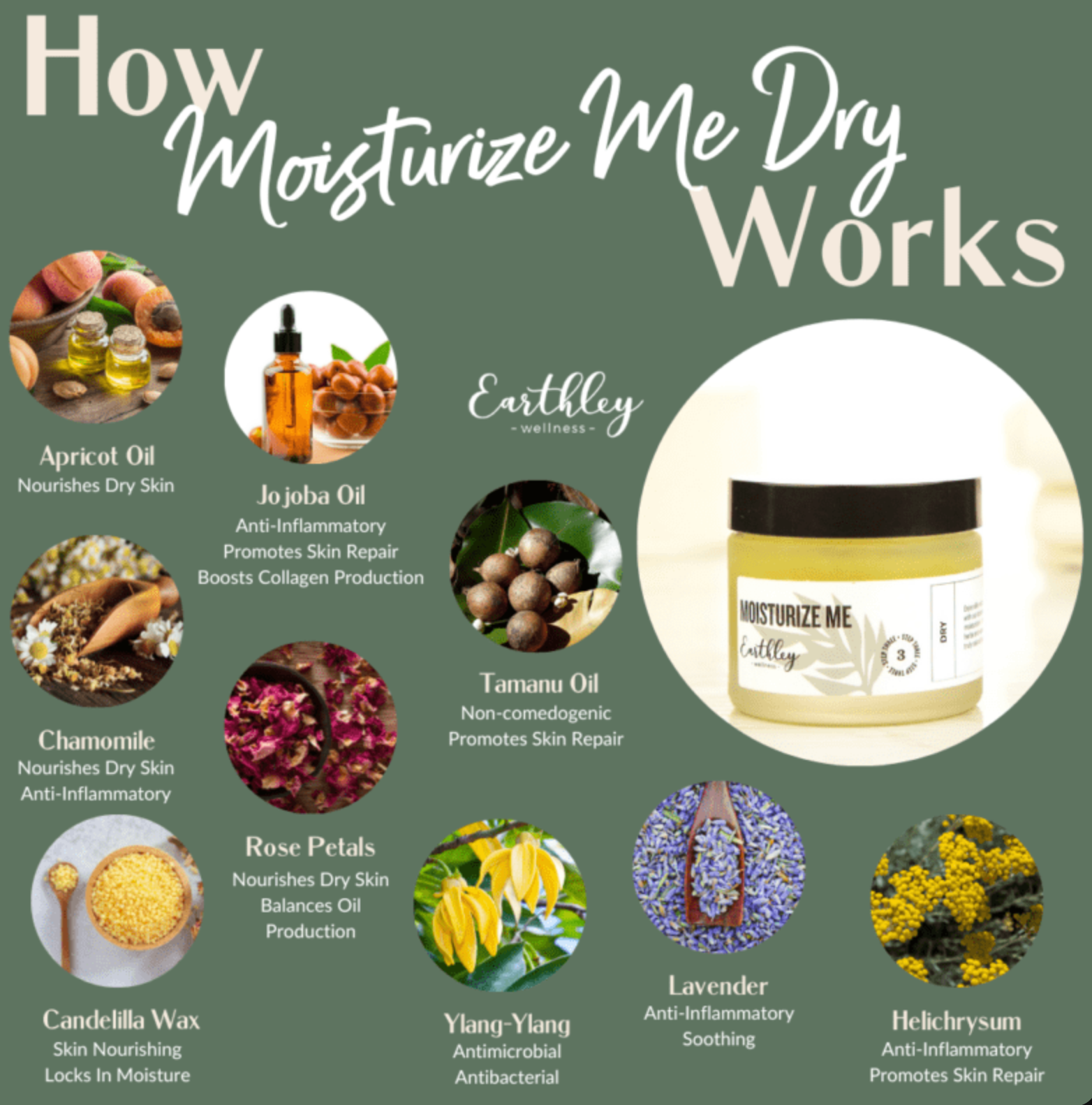 Moisturize Me is 'n heeltemal natuurlike en botaniese bevogtiger wat spesifiek vir die gesig ontwerp is. Geformuleer met nie-komedogene olies en essensiële olies, hierdie produk hidreer en vul die vel aan. Moisturize Me is voedsel vir die gesig wat die vel sal voed om bekommernisse soos aknee en droë, skilferige vel te verlig. Ons bied formules vir droë, olierige en kombinasievel.
