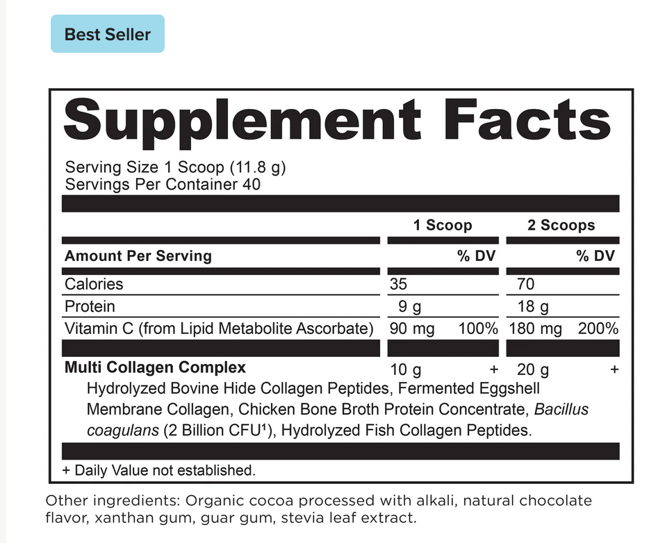 Hydrolyzed Bovine Collagen Peptides, Fermented Eggshell Membrane Collagen, Chicken Bone Broth Protein Concentrate, Bacillus coagulans (2 Billion CFU), Hydrolyzed Fish Collagen Peptides