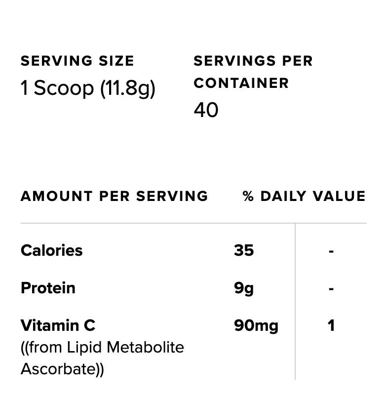 Vitamin C is known for its powerful antioxidant properties. Our Vitamin C is delivered in a gold-standard, lipid metabolite form — which means it’s easier for your body to absorb and retain, so you get more sustained benefits. Each serving of Multi Collagen Protein brings you 100% of your daily recommended value of Vitamin C.