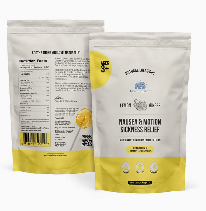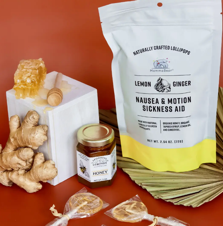 For temporary uneasiness due to motion sickness or otherwise, Lemon and Ginger Nausea & Motion Sickness Aid Lollipops gently soothe discomfort. Organic honey and tapioca syrup give a naturally sweet flavor, while honey’s antibacterial properties also aid in digestion. Concentrated lemon and ginger oils stimulate the immune system, alleviate nausea and help with an upset digestive system.