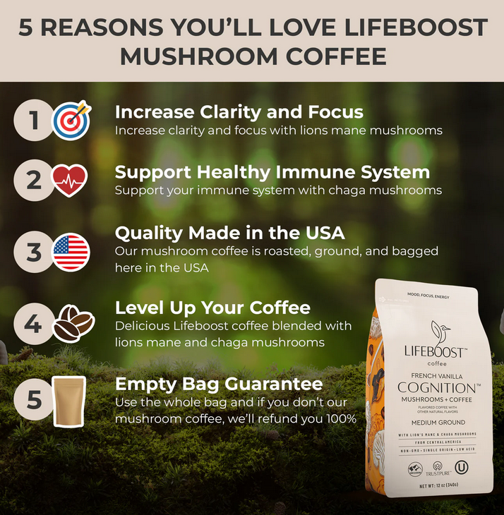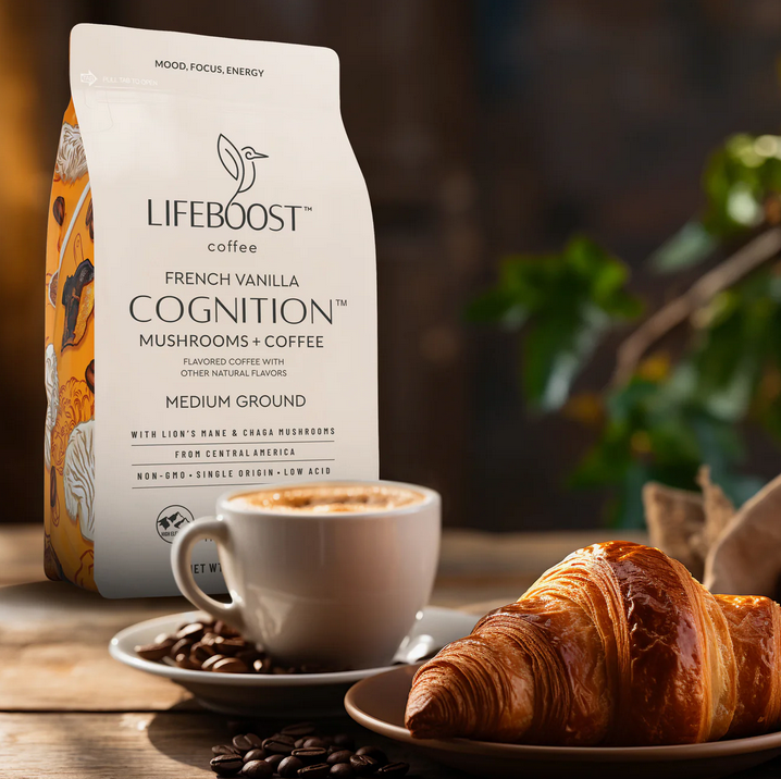 Lifeboost Coffee is thrilled to introduce " French Vanilla Cognition", a revolutionary leap in your morning ritual that blends the power of potent mushroom extracts with our beloved medium roast coffee. Cognition is not just another coffee; it's a meticulously crafted fusion of Lion's Mane and Chaga mushroom extracts, renowned for their cognitive-enhancing properties. These extracts are not ordinary; they are eight times more potent than what you'll find elsewhere, making Cognition the only low-acid mushroom coffee on the market with unparalleled strength.