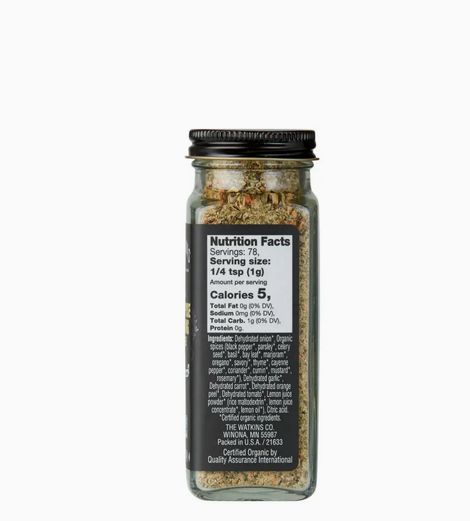 Watkins Organic All Purpose Seasoning bring 'n pittige mengsel van geur na jou gunstelinggeregte sonder enige sout.