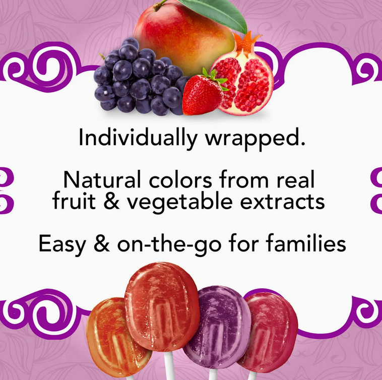 PURE & SIMPLE: Our delicious Lollipops are organic and vegan! They come in natural flavors of Grape, Pomegranate, Strawberry, & Mango, plus they are individually wrapped making them easy to take on-the-go or share with a friend.