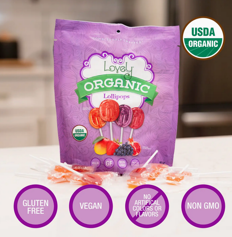 CONSCIOUSLY CRAFTED: 100% of the products we create here at Lovely Candy Co. are made with your health in mind. That's why our Lollipops are completely ORGANIC, VEGAN, NON-GMO, GLUTEN-FREE and will NEVER contain any High Fructose Corn Syrup or Artificial Ingredients.