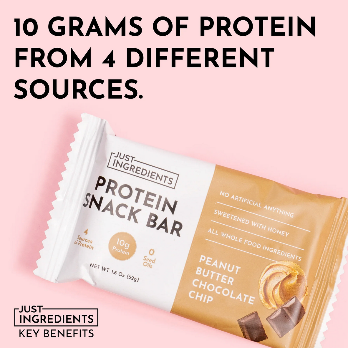 A protein snack bar made with real food. The Peanut Butter Chocolate Chip Protein Snack Bar is made with wholesome ingredients like peanut butter, dates, coconut oil, honey, and organic oats. With 10g of protein from grass-fed whey, pea, pumpkin seed, and chia seed protein. No seed oils, artificial preservatives, and natural or artificial flavors—just simple ingredients you can feel good about snacking on.