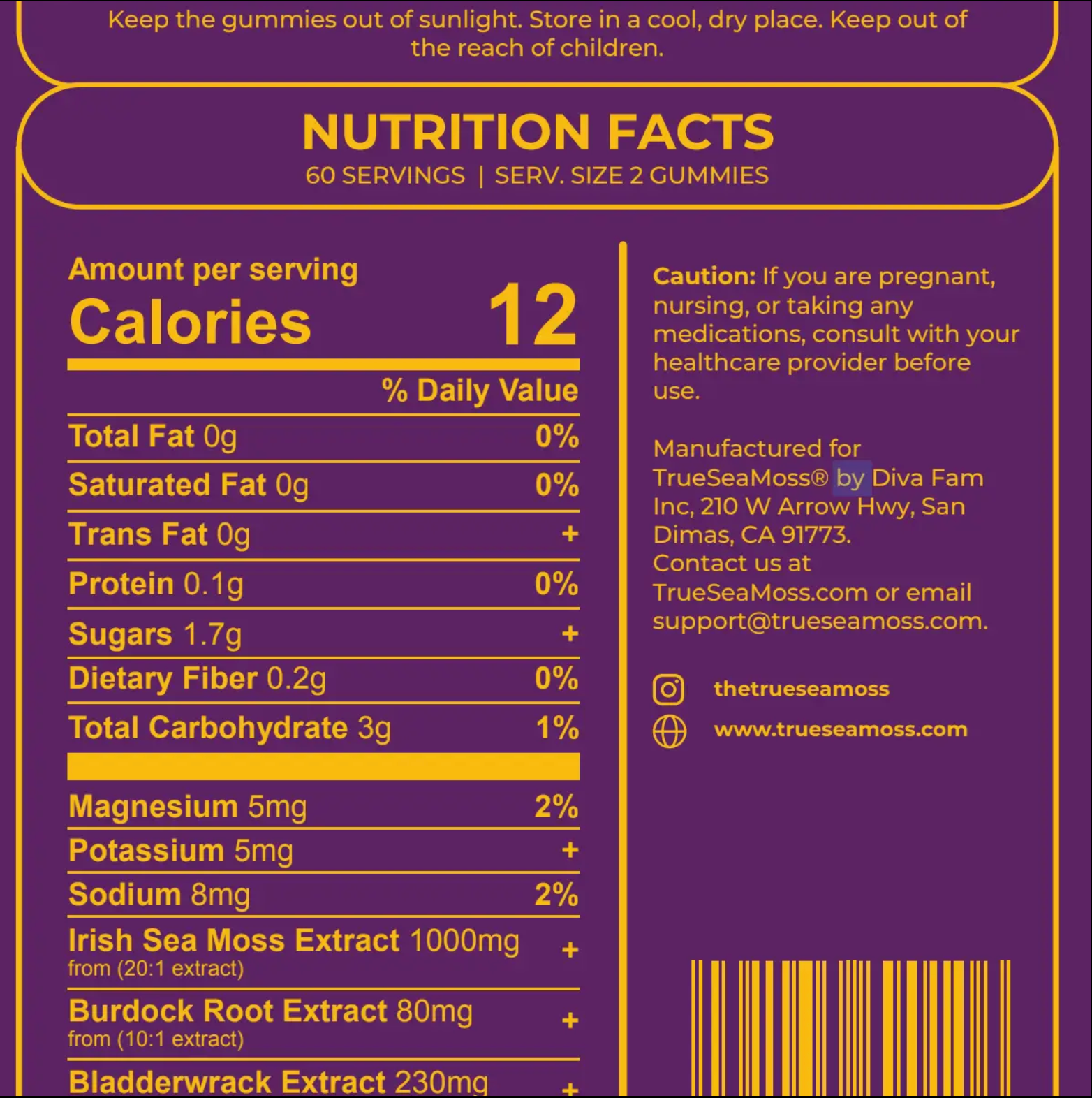 TrueSeaMoss offers delicious and nutritious elderberry gummies containing 1000mg of Irish Sea Moss, a superfood that contains 92 essential minerals required for optimal body function and Elderberry 450mg.