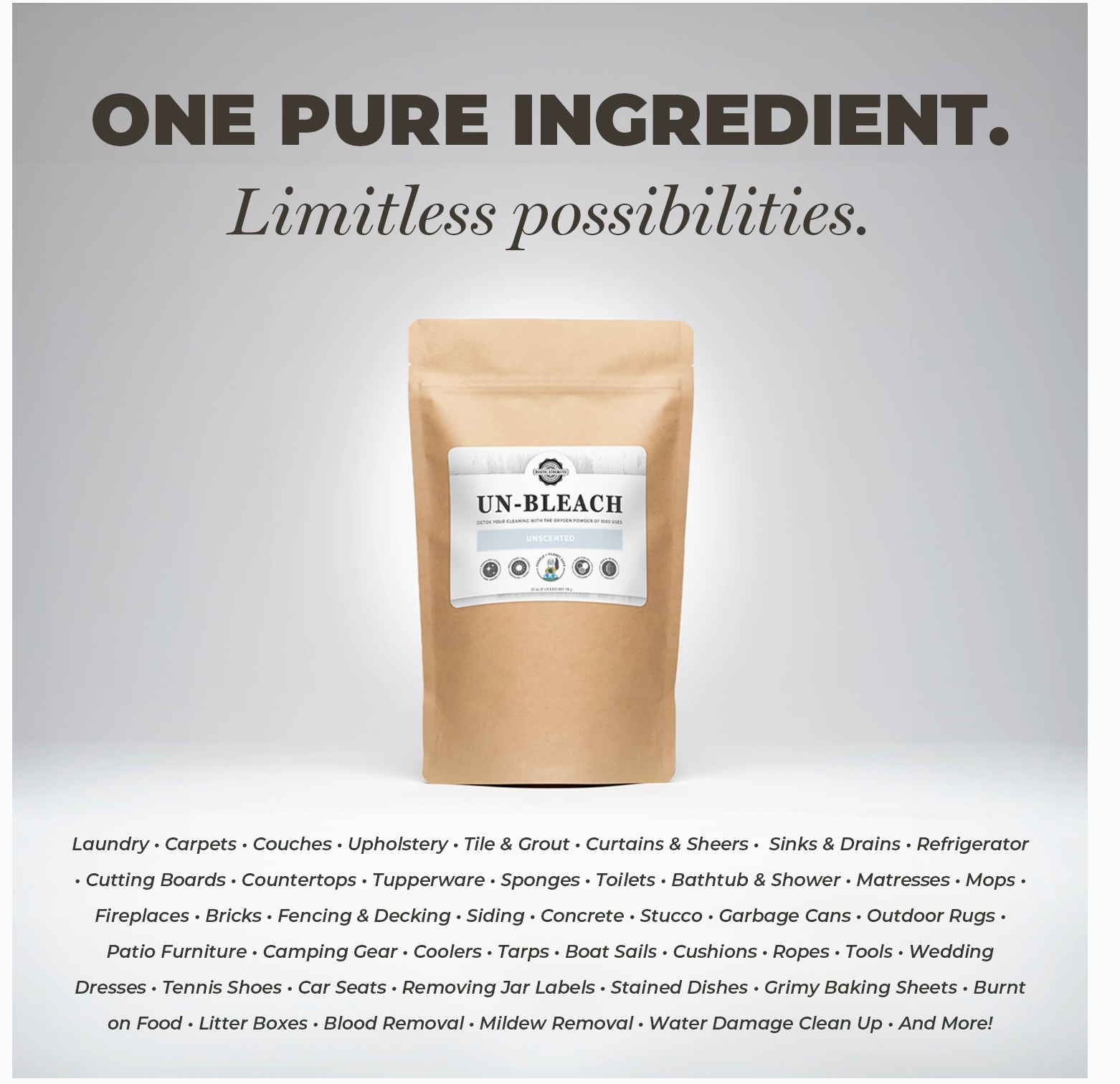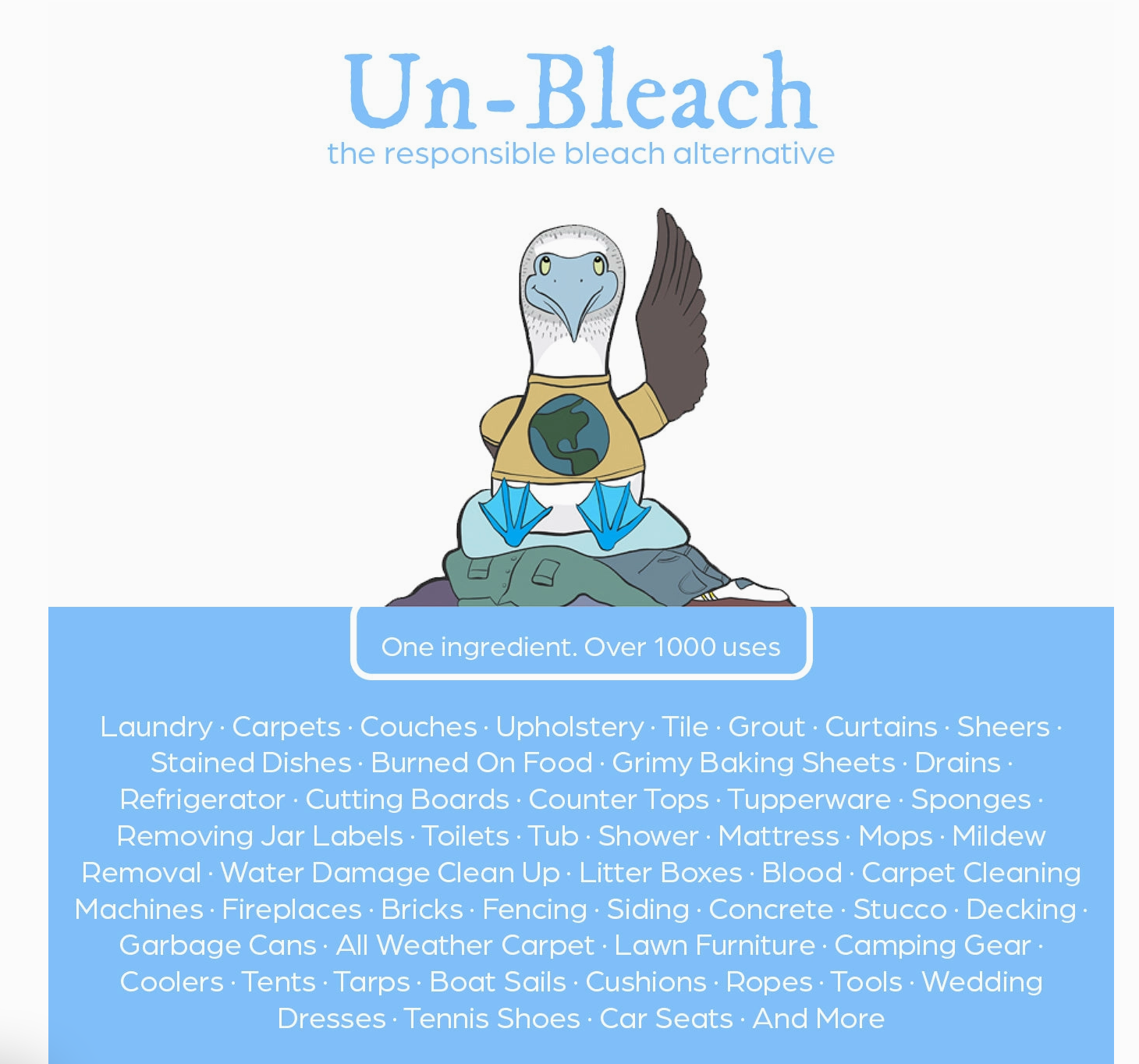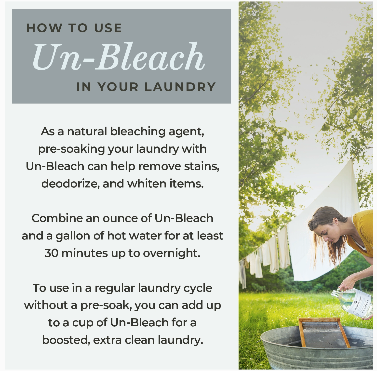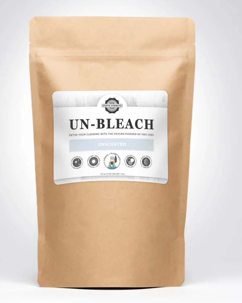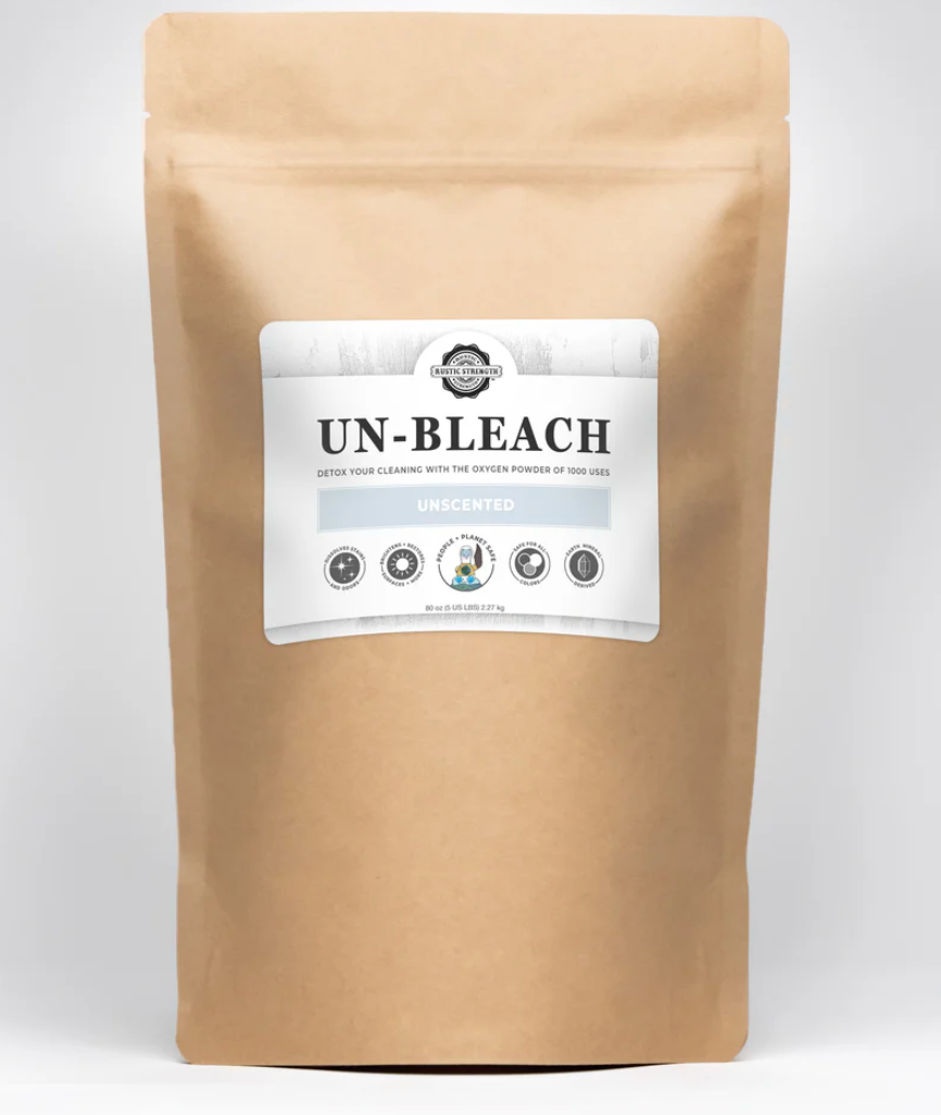 Wasgoed Voordeurweek om vlekke te help verwyder, items soos klere, menstruasieblokkies, skoene en doeke te deodoriseer en wit te maak. Gebruik 'n bad of emmer, voeg 1 ons (2 EL) Un-Bleach by en week in warm water (100 tot 150˚F) vir ten minste 30 minute tot oornag. Was soos gewoonlik.