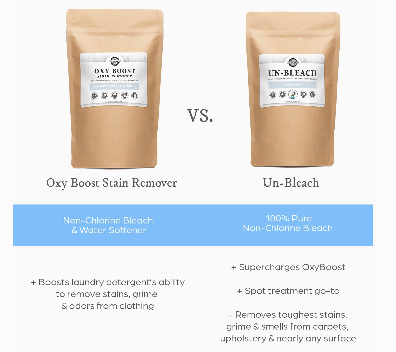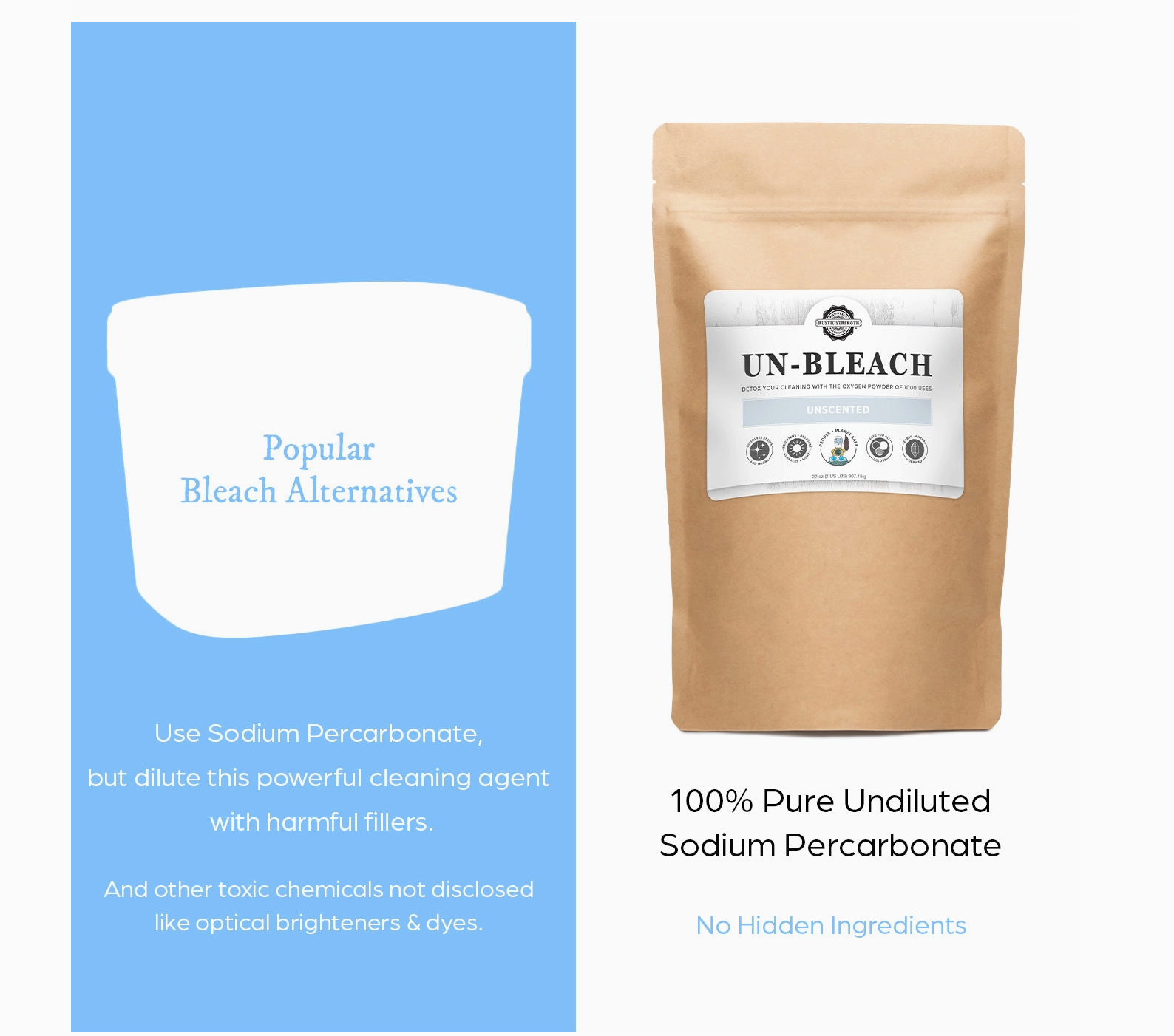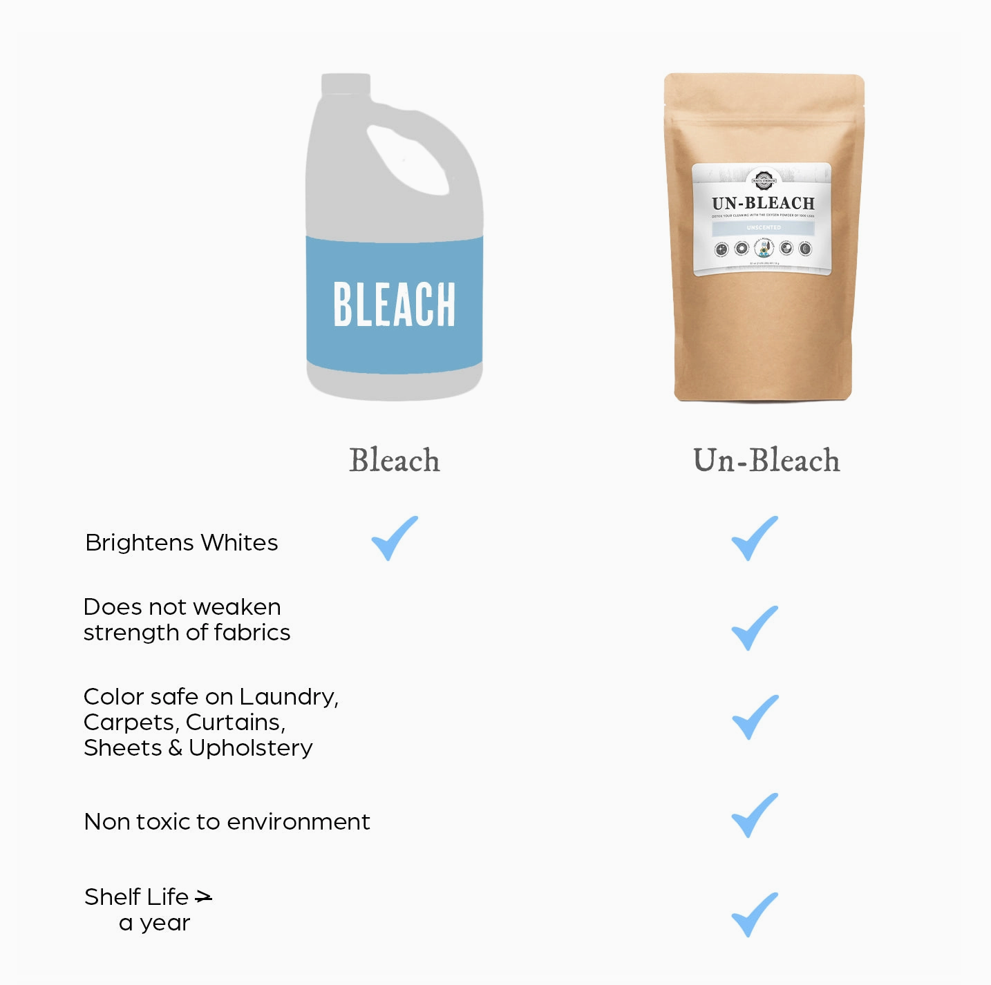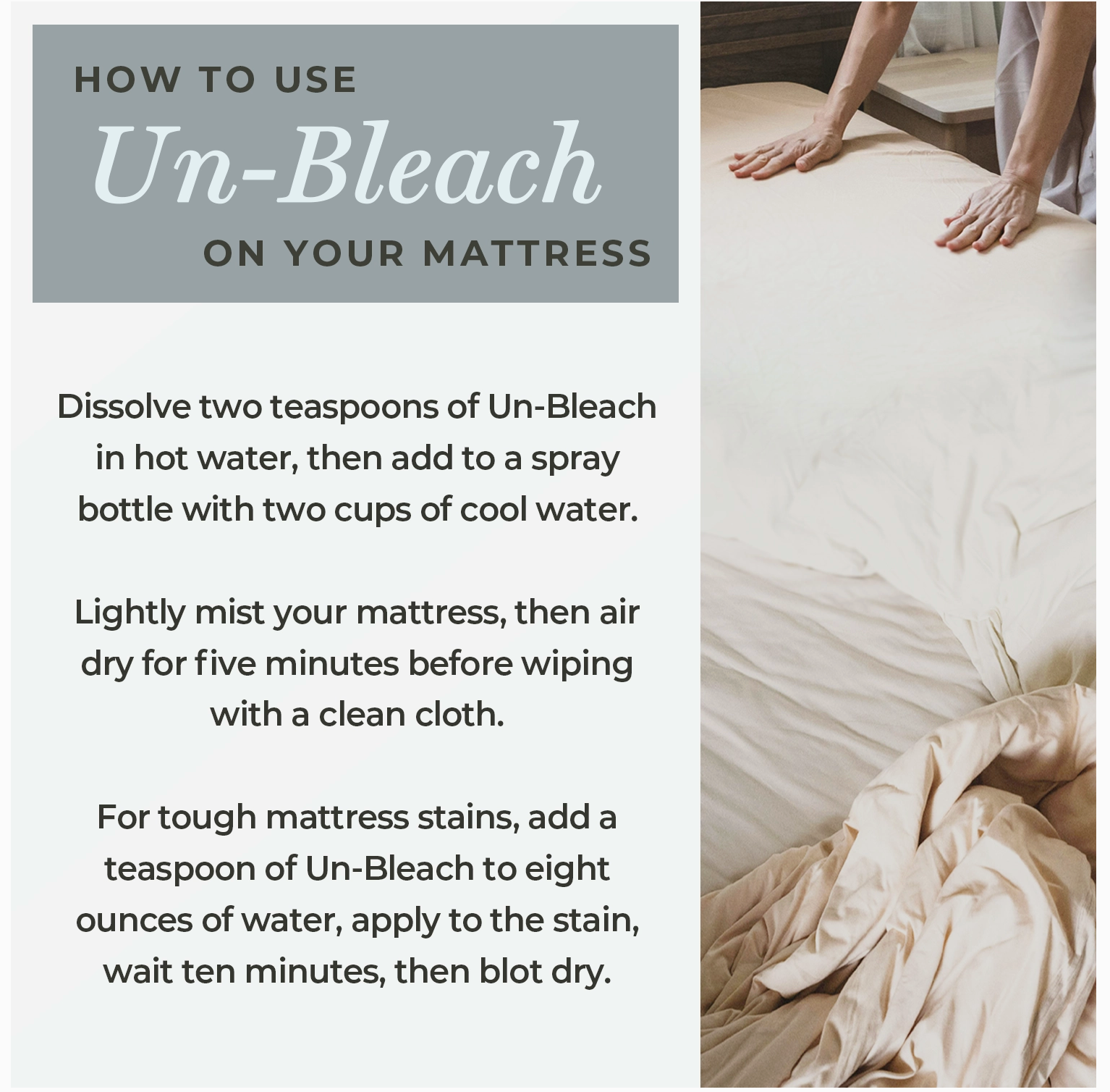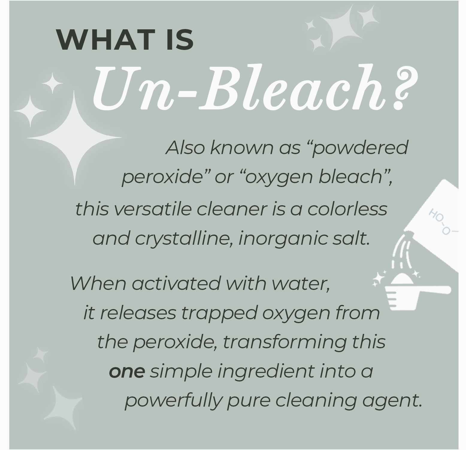 Wasgoed Voordeurweek om vlekke te help verwyder, items soos klere, menstruasieblokkies, skoene en doeke te deodoriseer en wit te maak. Gebruik 'n bad of emmer, voeg 1 ons (2 EL) Un-Bleach by en week in warm water (100 tot 150˚F) vir ten minste 30 minute tot oornag. Was soos gewoonlik.