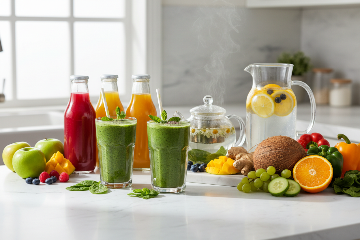 Elementos esenciales de limpiezaProductos de limpieza, estropajos, jabón, detergente para lavavajillas.