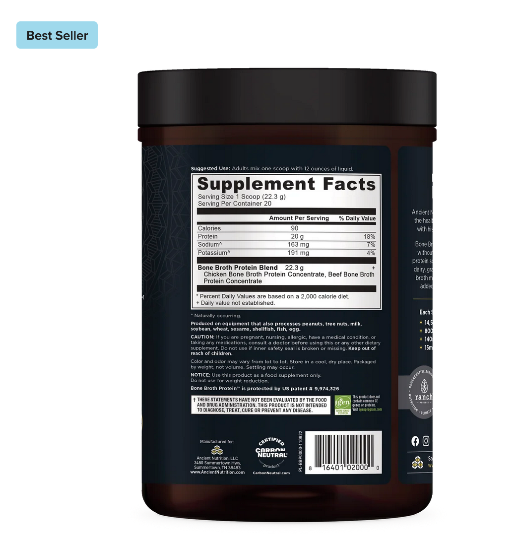 - Includes chicken bone broth protein concentrate and beef bone broth protein concentrate