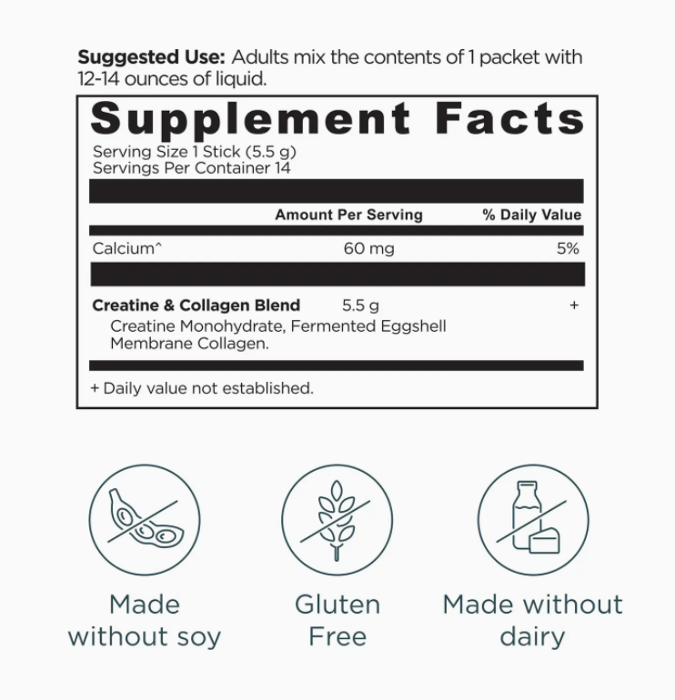These convenient stick packs combine 5g of creatine monohydrate and clinically validated fermented eggshell membrane collagen to support lean body mass, recovery and cognitive health. * Supports muscle strength * Promotes cognitive health * Supports joint comfort & mobility
