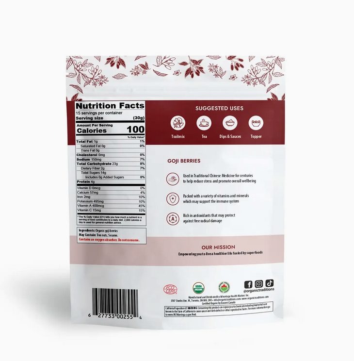 Las bayas de Goji son un superalimento rico en nutrientes y repleto de antioxidantes y vitaminas. Con 3 gramos de proteína por porción y altos niveles de vitamina A y C, estas bayas pueden fortalecer el sistema inmunológico y promover una piel saludable. Agregue un puñado a sus batidos o mezcla de frutos secos para obtener un delicioso aporte de nutrición.