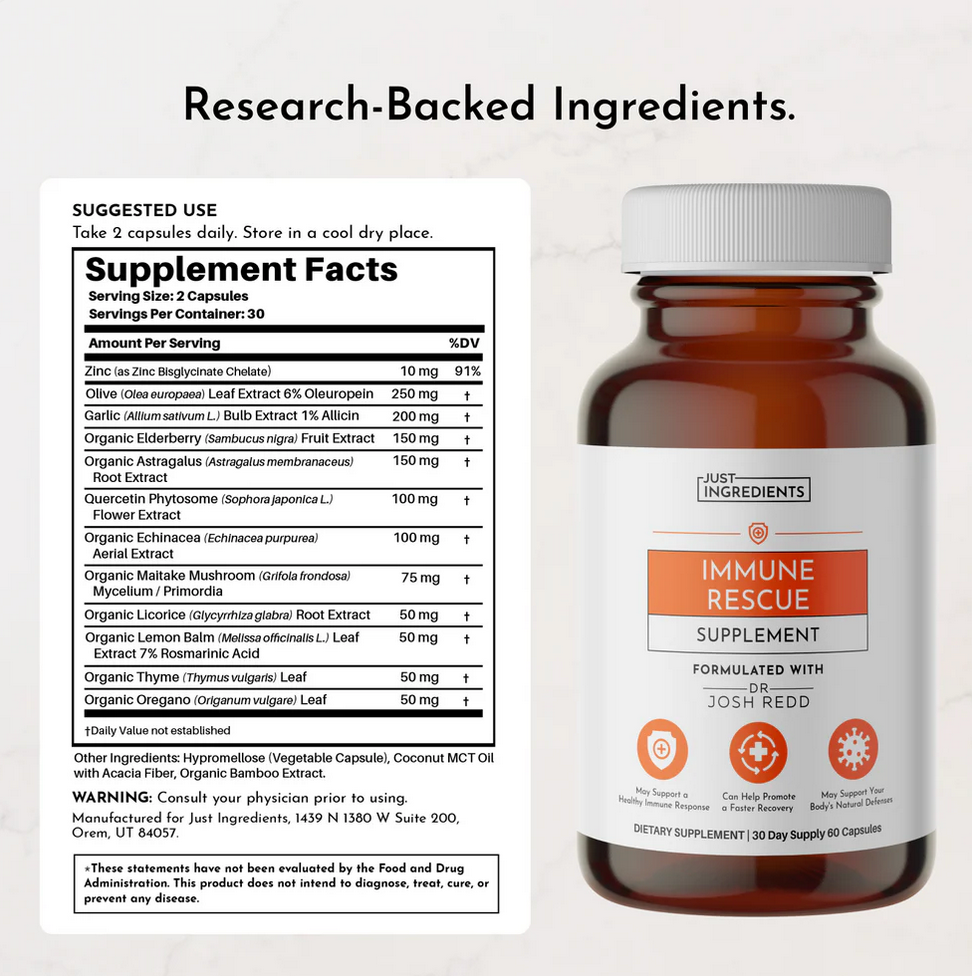 Zinc (as Zinc Bisglycinate Chelate), Olive (Olea europaea) Leaf Extract 6% Oleuropein, Garlic (Allium sativum L.) Bulb Extract 1% Allicin, Organic Elderberry (Sambucus nigra) Fruit Extract, Organic Astragalus (Astragalus membranaceus) Root Extract, Quercetin Phytosome (Sophora japonica L.) Flower Extract, Organic Echinacea (Echinacea purpurea) Aerial Extract, Organic Maitake Mushroom (Grifola frondosa) Mycelium / Primordia, Organic Licorice (Glycyrrhiza glabra) Root Extract, Organic Lemon Balm (Melissa officinalis L.) Leaf Extract 7% Rosmarinic Acid, Organic Thyme (Thymus vulgaris) Leaf, Organic Oregano (Origanum vulgare) Leaf
