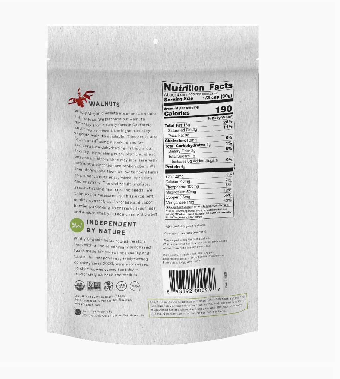 Provienen de una granja de California y representan las nueces orgánicas de mayor calidad disponibles. Estas nueces se “activan” mediante un método de remojo y deshidratación a baja temperatura en las instalaciones de Wildly Organics.