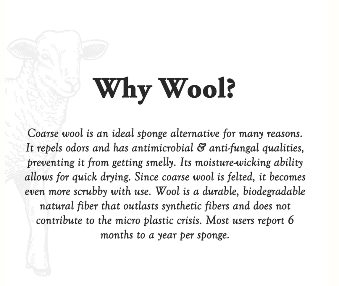 Por qué lana | La lana gruesa es una alternativa ideal a las esponjas por muchas razones. Repele los olores y tiene propiedades antimicrobianas y antifúngicas, lo que evita que se vuelva maloliente. Su capacidad para absorber la humedad permite un secado rápido. La lana es una fibra natural duradera y biodegradable que dura más que las fibras sintéticas y no contribuye a la crisis de los microplásticos. La mayoría de los usuarios informan que cada esponja dura entre 6 meses y un año.