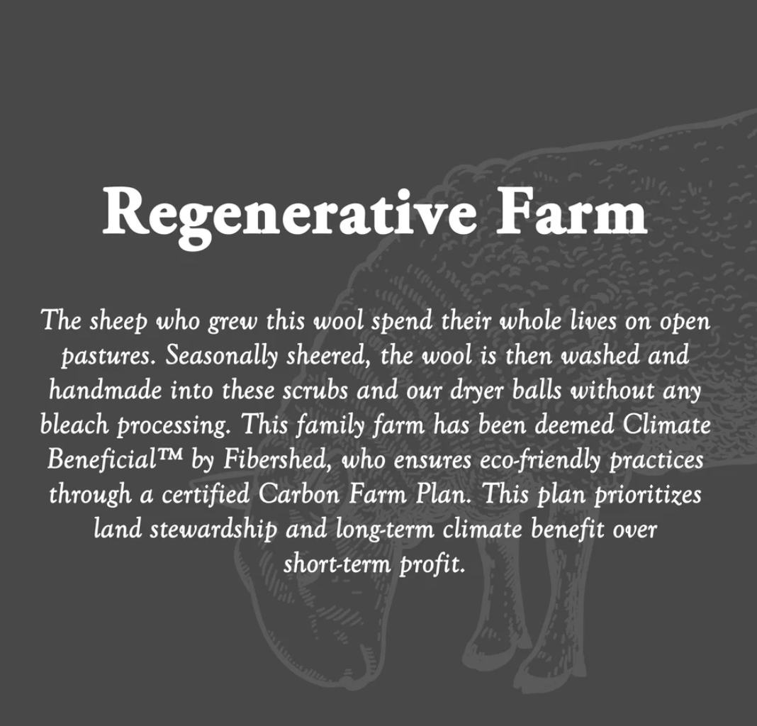 Granja regenerativa | Las ovejas que crían esta lana pasan toda su vida en pastizales abiertos. La lana se descascara según la temporada, luego se lava y se elabora a mano para fabricar estos exfoliantes y nuestras bolas para secadora sin ningún procesamiento con lejía. Esta granja familiar ha sido considerada Climate Beneficial ™ por Fibershed , que garantiza prácticas ecológicas a través de un Plan de granja de carbono certificado. Este plan prioriza la administración de la tierra y los beneficios climáticos a largo plazo por sobre las ganancias a corto plazo.