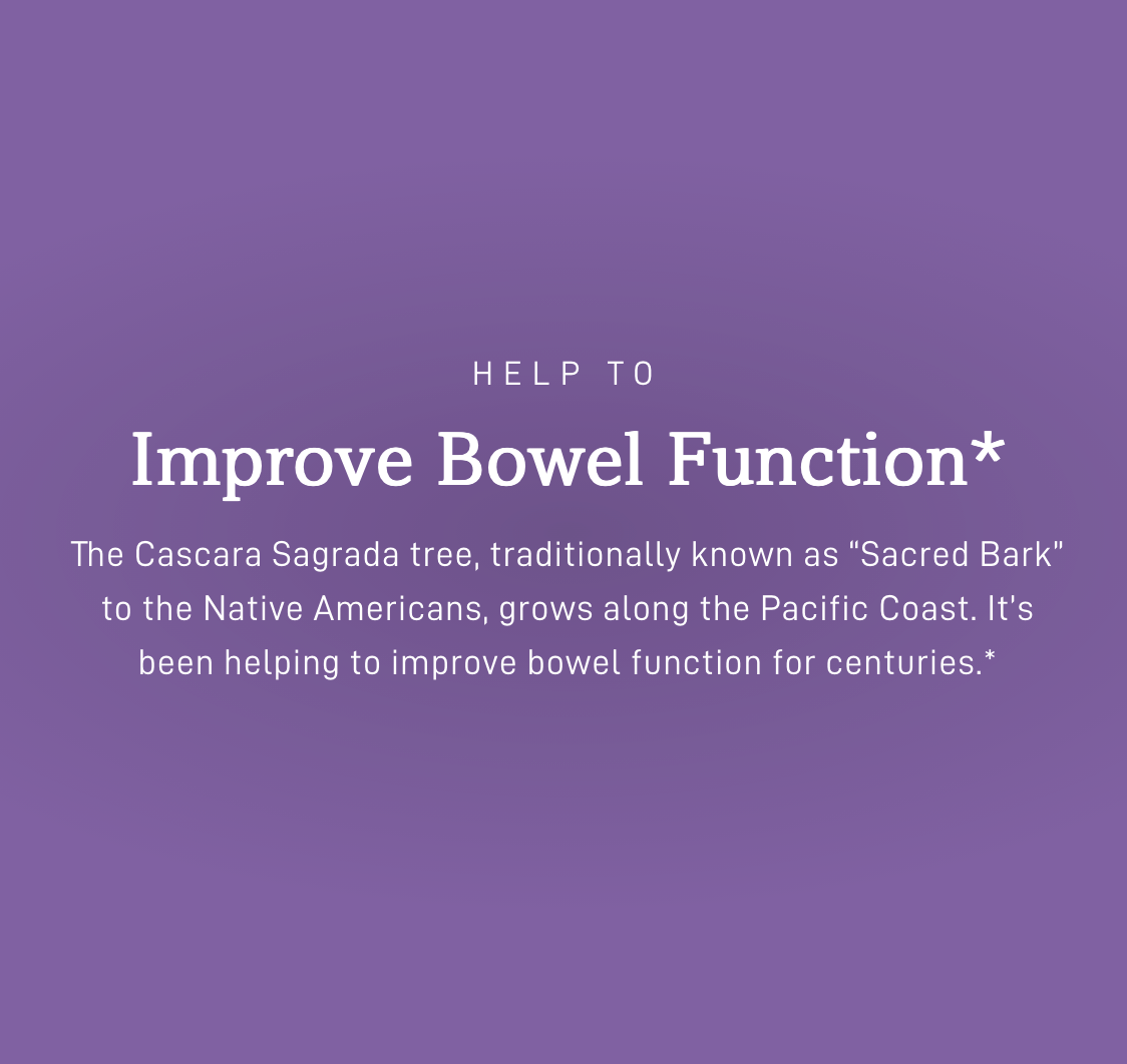The Cascara Sagrada tree, traditionally known as “Sacred Bark” to the Native Americans, grows along the Pacific Coast. It’s been helping to improve bowel function for centuries.*