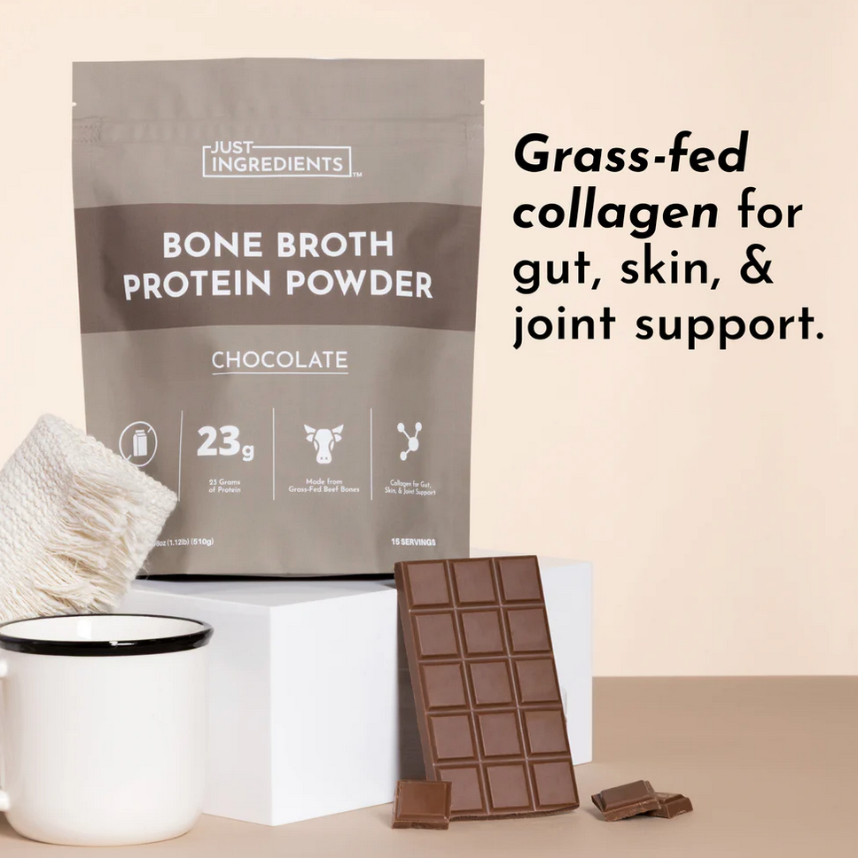 Just Ingredients Chocolate Protein Powder is a dairy-free protein made with real cacao for a creamy, rich flavor. We use high-quality, real-food ingredients—no artificial sweeteners or colors, no natural or artificial flavors, no added sugar, and no harsh solvents. Each serving combines nutrient-rich grass-fed beef bone broth to help nourish the gut and support immune health, plus grass-fed collagen to help maintain healthy skin and joints. It’s protein that’s as good for your body as it is for your taste buds.