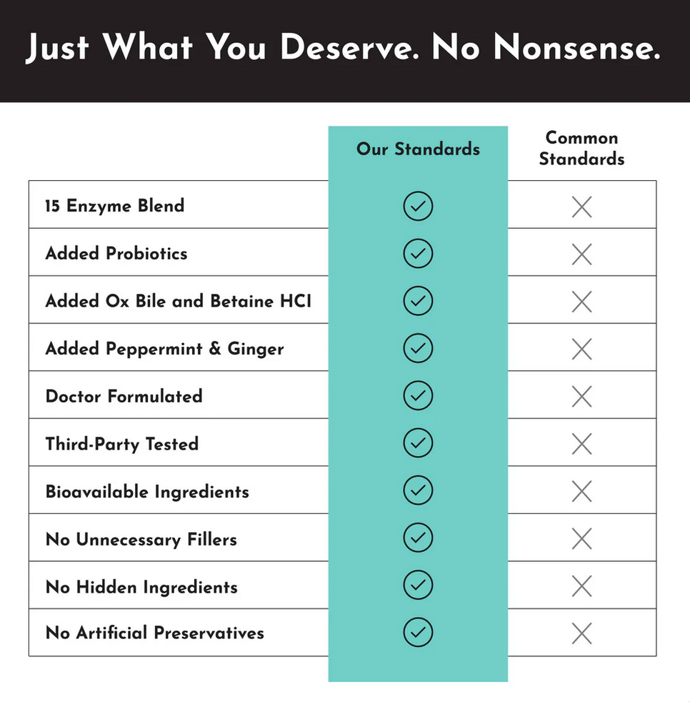 Support healthy digestion with our 15-enzyme blend, designed to help break down proteins (including gluten), fats, carbohydrates (including lactose), and fiber. Added ox bile may support fat digestion and the absorption of fat-soluble vitamins, while betaine HCl may help maintain healthy stomach acid levels. Organic ginger and peppermint extracts provide gentle digestive comfort and may help ease occasional nausea, bloating, and gas. Plus, our 3 billion CFU probiotic blend may help support a balanced gut microbiome for overall digestive wellness.*