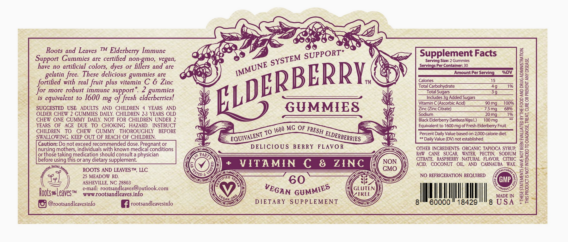 INGREDIENTS: Vitamin C (ascorbic acid) 90 mg, Zinc (Zinc Citrate) 7.5 mg, Black Elderberry (Sambacus Nigra) 1600 MG fresh, 100 mg Dried, Organic Tapioca Syrup, Raw Cane Sugar, Water, Pectin, Sodium Citrate, Raspberry Natural Flavor, Citric Acid, Coconut Oil and Carnauba Wax.