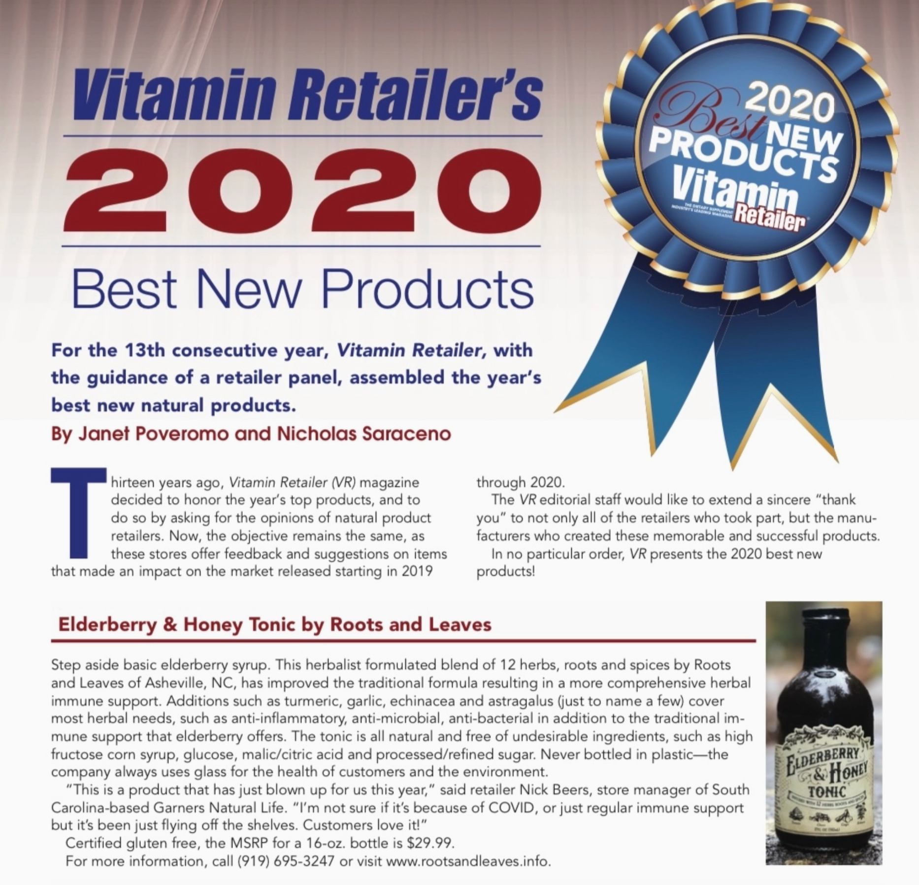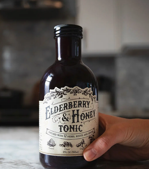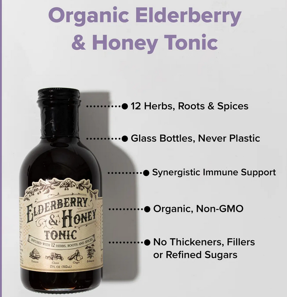 We infuse 12 total herbs and roots into the tonic (why we don't call it the typical elderberry "Syrup"..plus it's not a thick consistency since we use zero thickeners) and use raw unfiltered honey, rose hips and hibiscus to naturally sweeten our product. Voted best new immune product in 2020 by retailer magazine.