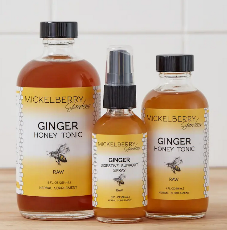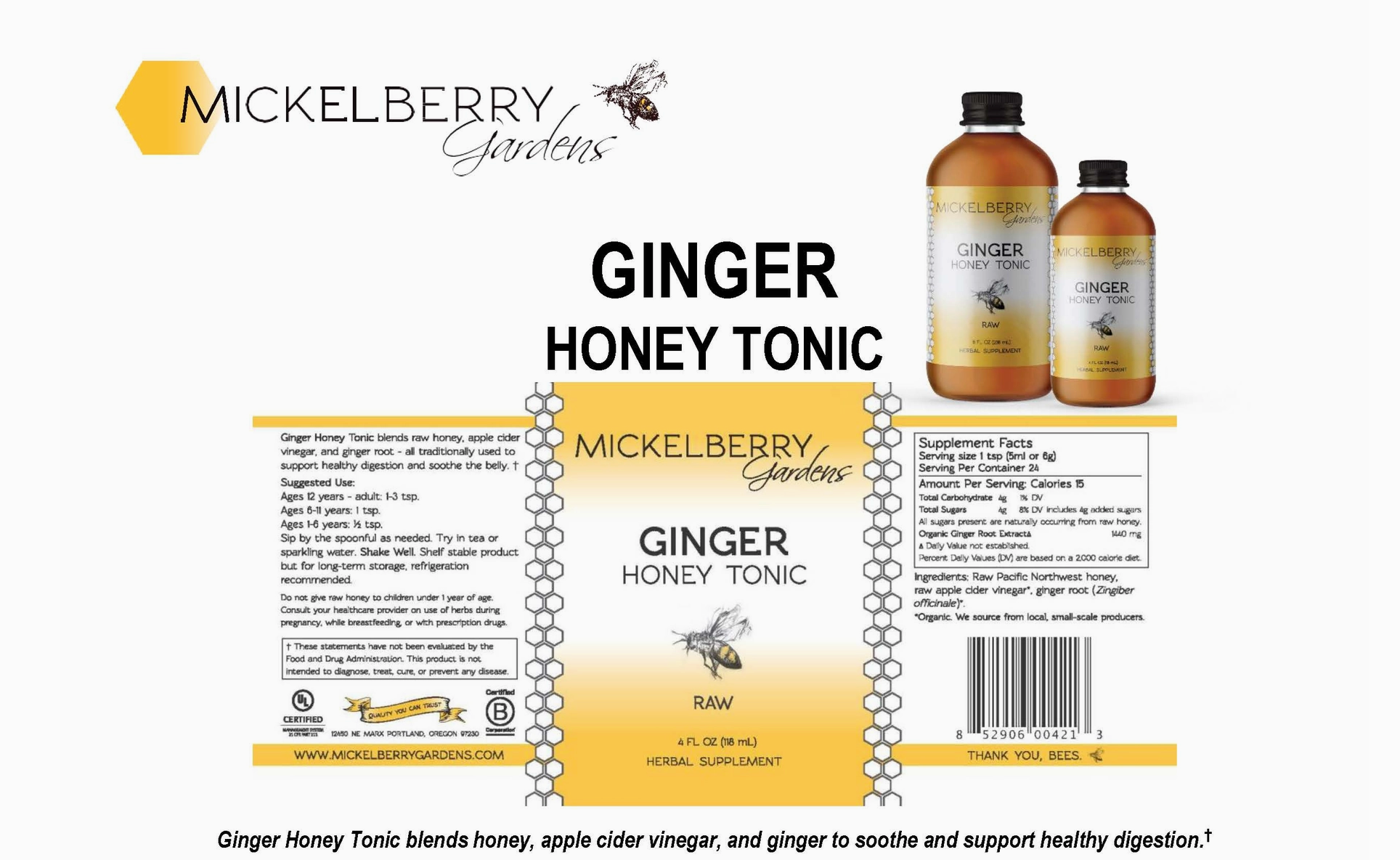 Mickelberry Gardens Ginger Honey Tonic is a blend of raw Pacific Northwest wildflower honey, organic raw apple cider vinegar and organic ginger root (Zingiber officinalis). This tonic is designed to support good digestion and a happy belly.