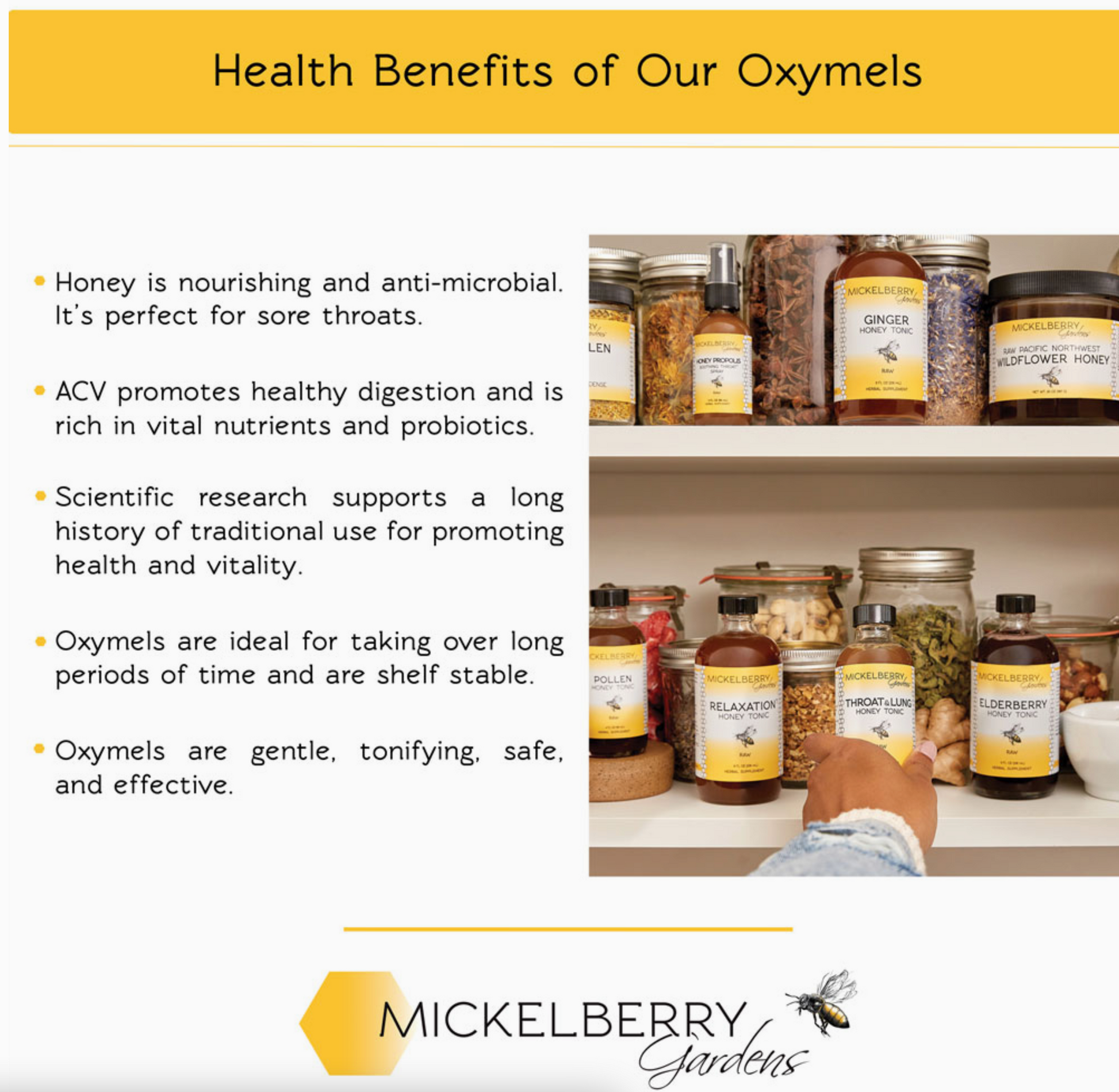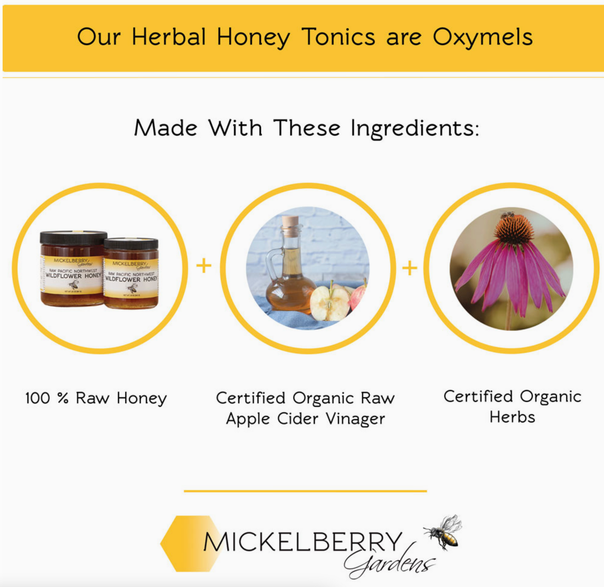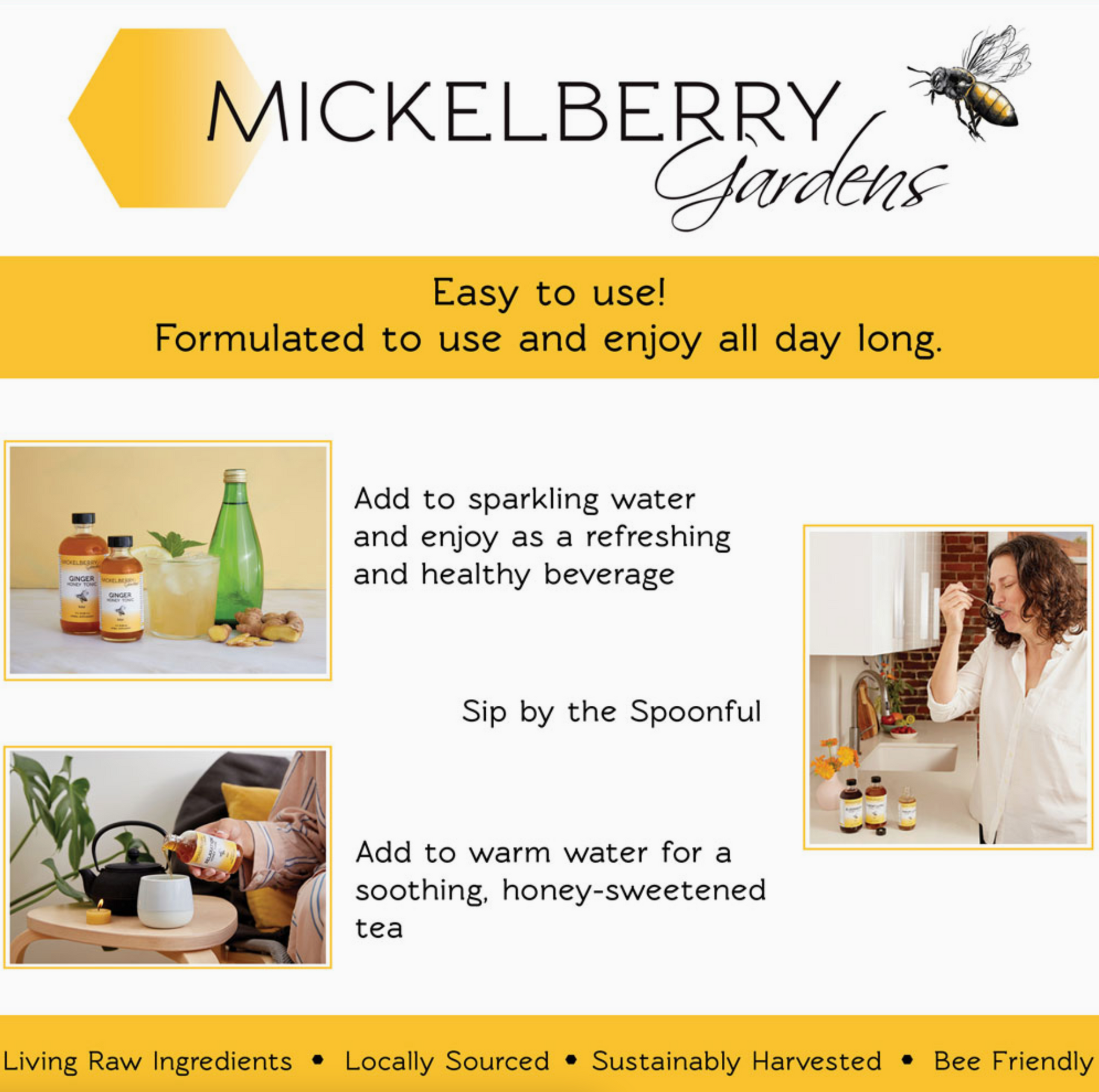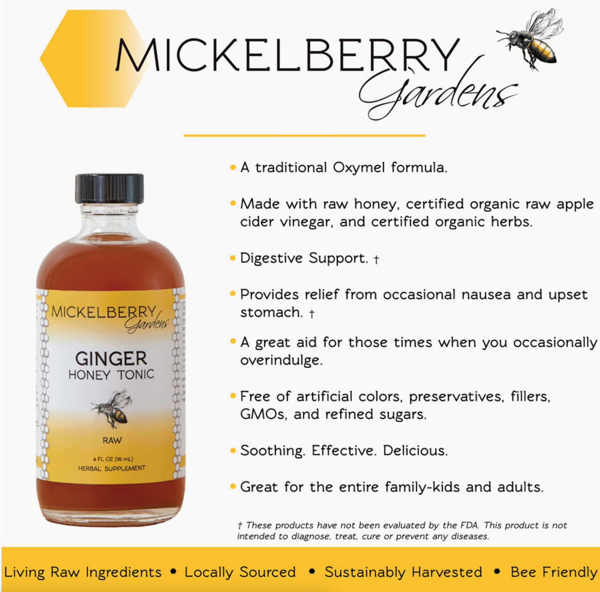Mickelberry Gardens Ginger Honey Tonic is a RAW oxymel – made with local raw honey and raw apple cider vinegar.