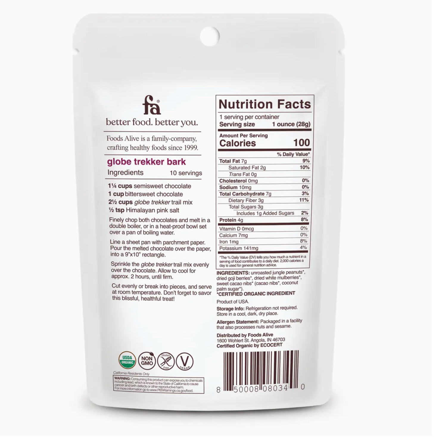 Jungle peanuts*, sweet cacao nibs* (cacao nibs*, coconut palm sugar*), goji berries*, white mulberries* (*Organic Ingredient)