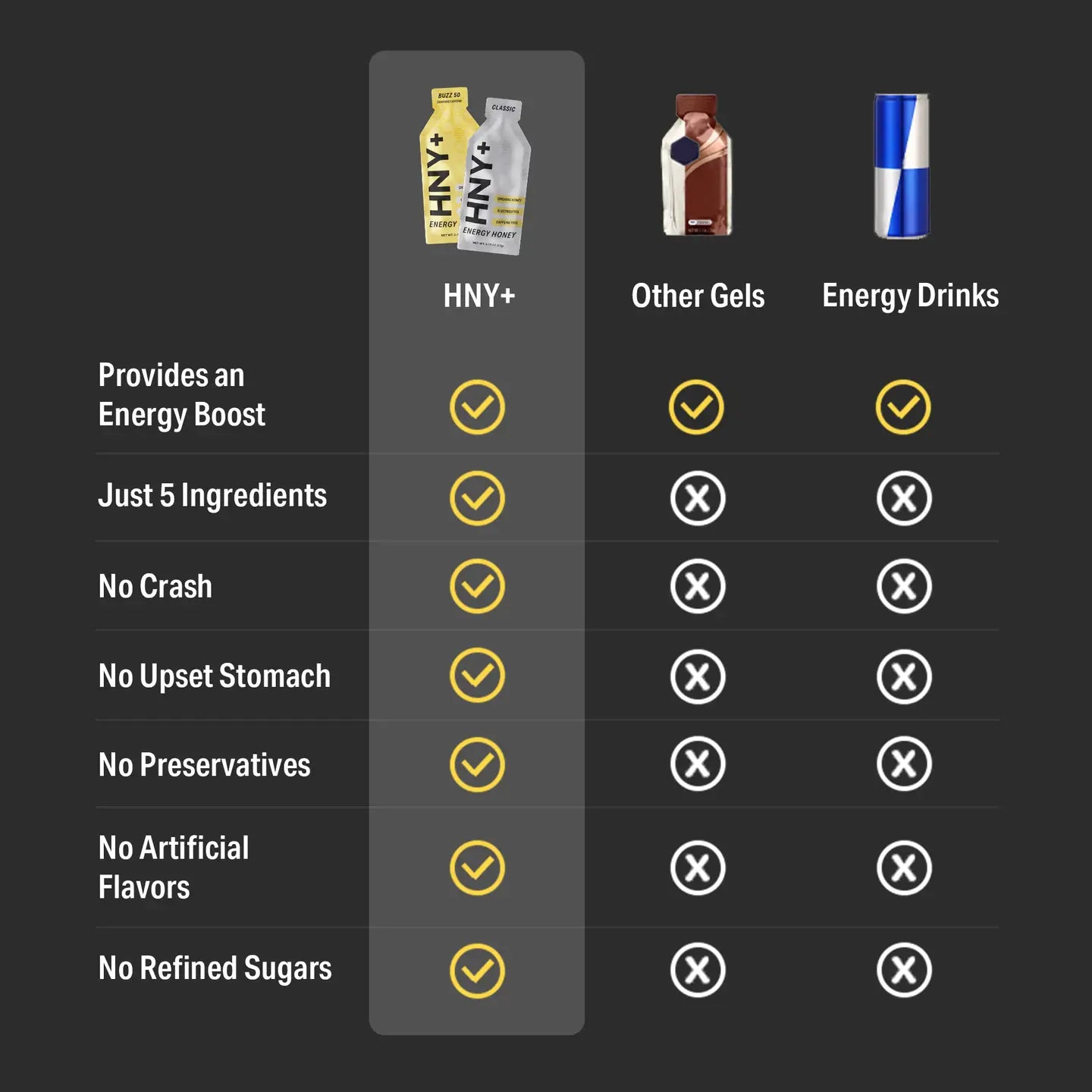 • ORGANIC HONEY ENERGY PACKET: HNY+ is an anti-synthetic energy gel: no additives, no mystery chemicals, no crash. Just functional ingredients that support energy and hydration.