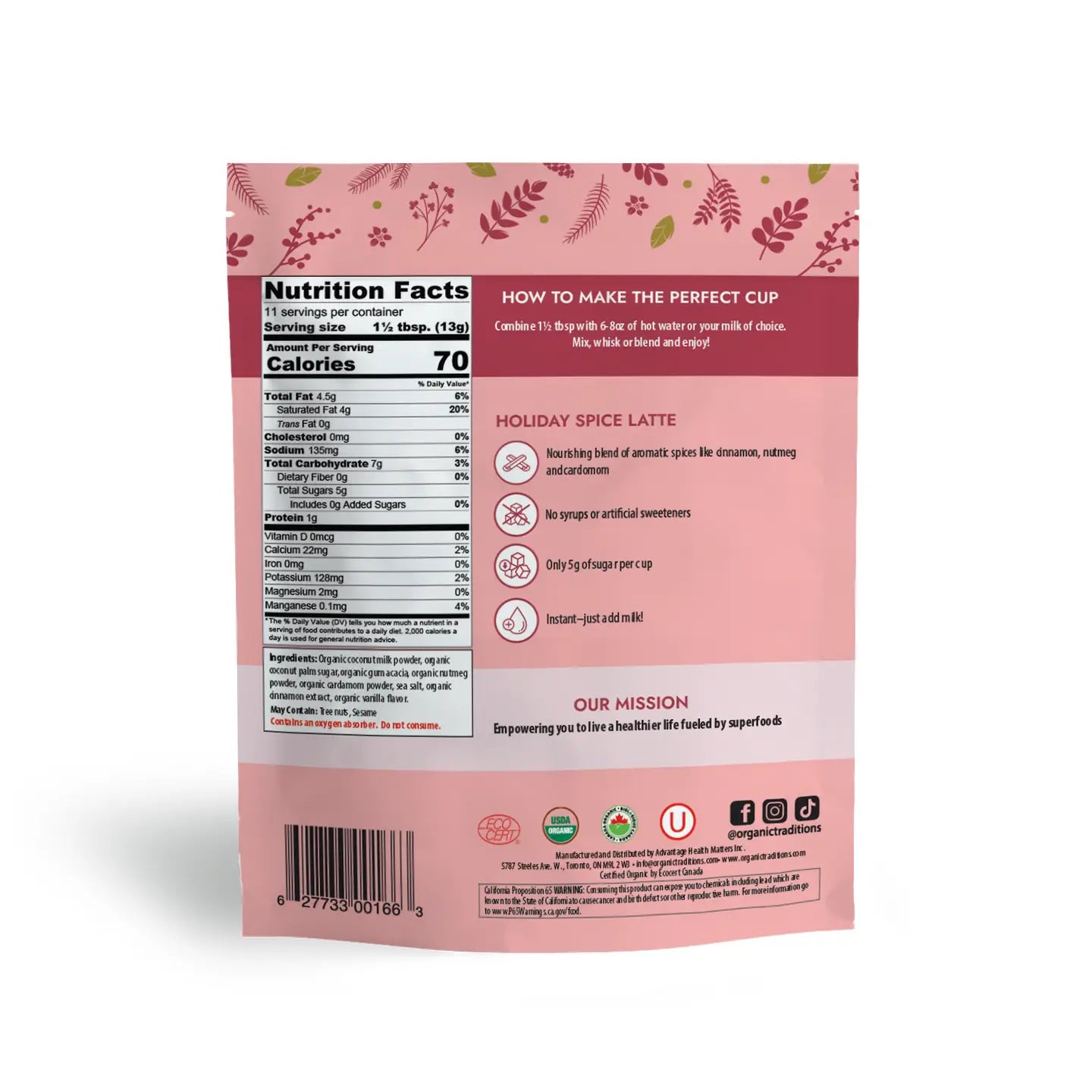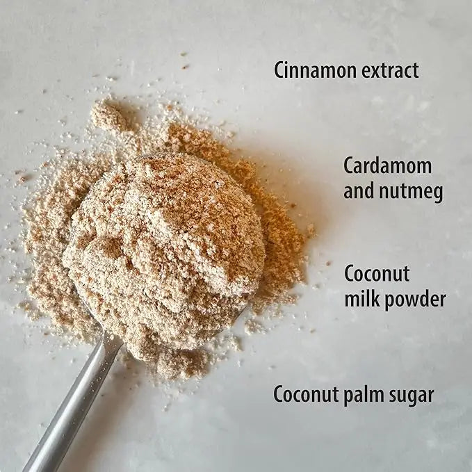 Ingredients: organic coconut milk powder, organic coconut palm sugar, organic gum acacia, organic nutmeg powder, organic cardamom powder, sea salt, organic cinnamon extract, organic vanilla flavor