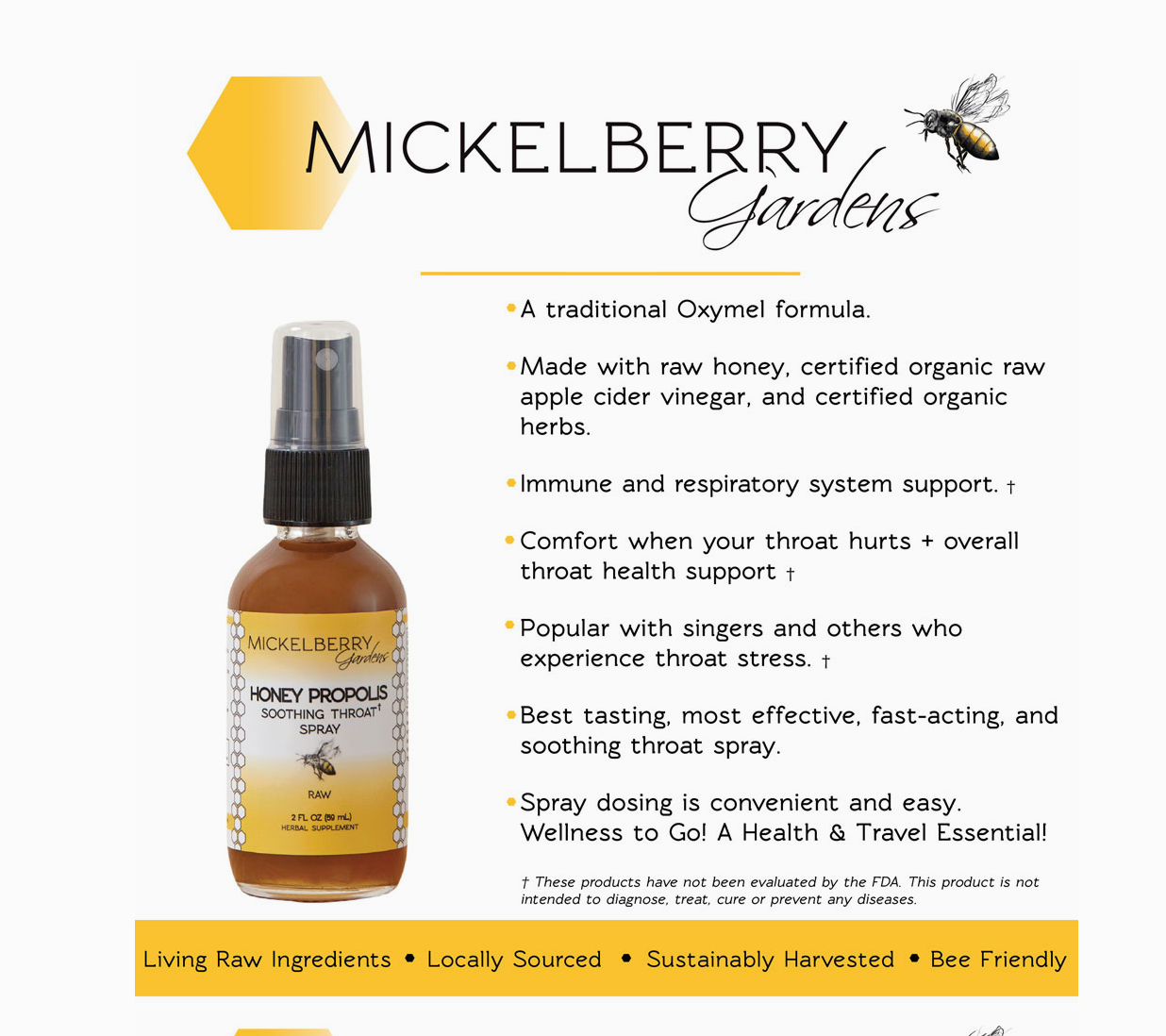 Mickelberry Gardens Honey Propolis Throat Spray is designed to soothe and tone throat tissues. People who frequently suffer from sore throats or spend lots of time using vocal cords (such as talking or singing) will enjoy rejuvenating their throat. Smokers can also benefit from a regular spritz. This throat spray contains propolis, which works its antiseptic magic to keep your throat strong and healthy.