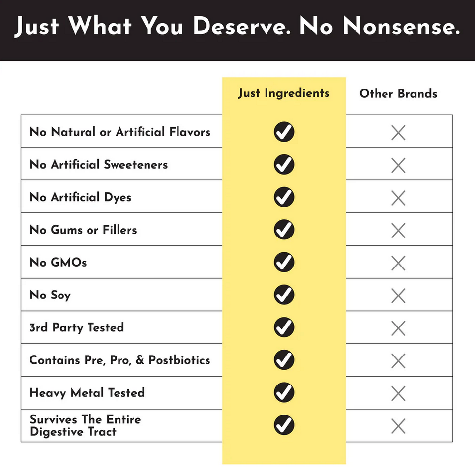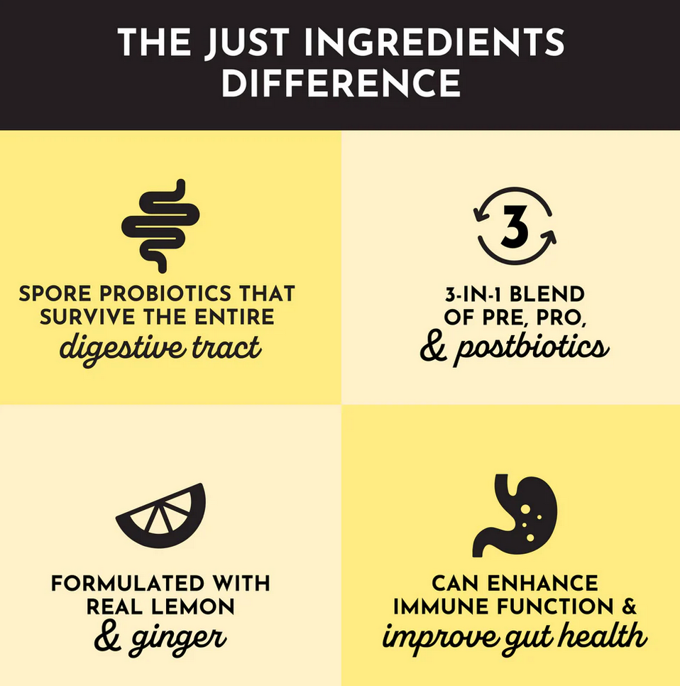 One of the only probiotic blends with postbiotics and flavored with real fruit.* Just Ingredients Probiotic Complex is a 3-in-1 blend of prebiotics, probiotics, and postbiotics designed to support gut health, digestive balance, and immune function.* It delivers 5 billion CFUs from spore-forming probiotic strains—carefully selected for their ability to survive digestion and reach the gut where they’re most effective. Formulated with real lemon and ginger to help support immunity and soothe digestion, this fruit-flavored blend contains no artificial flavors, sweeteners, colors, or natural flavors.