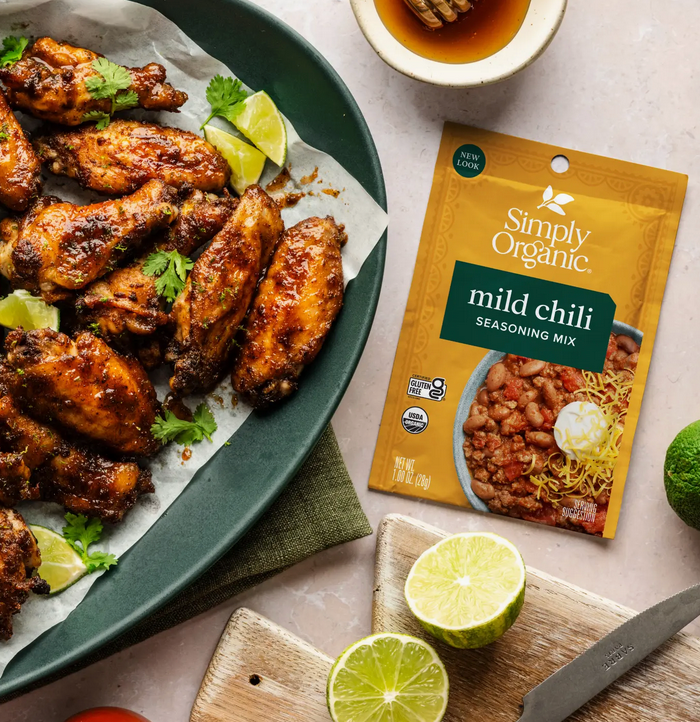 Simply Organic® Mild Chili Seasoning Mix blends organic cumin, smoked paprika, chili pepper, and aromatic spices to deliver full-bodied, savory chili flavor with just a touch of heat.