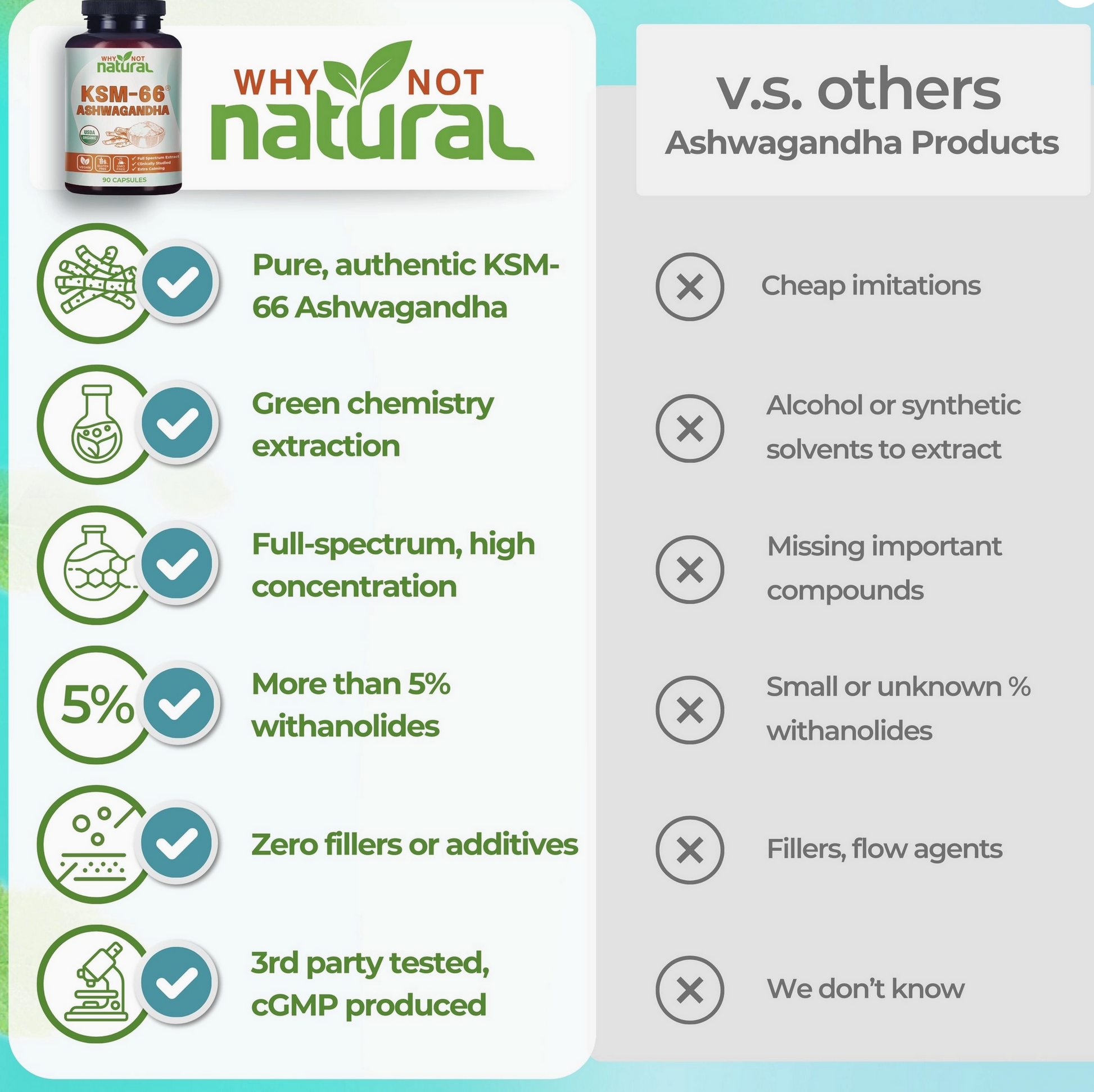 Highest concentration and lowest impurities: KSM-66 Ashwagandha has more than 5% withanolides - the highest percentage of all branded root-only extracts, and almost no Withafarin A, a withanolide that should be avoided.