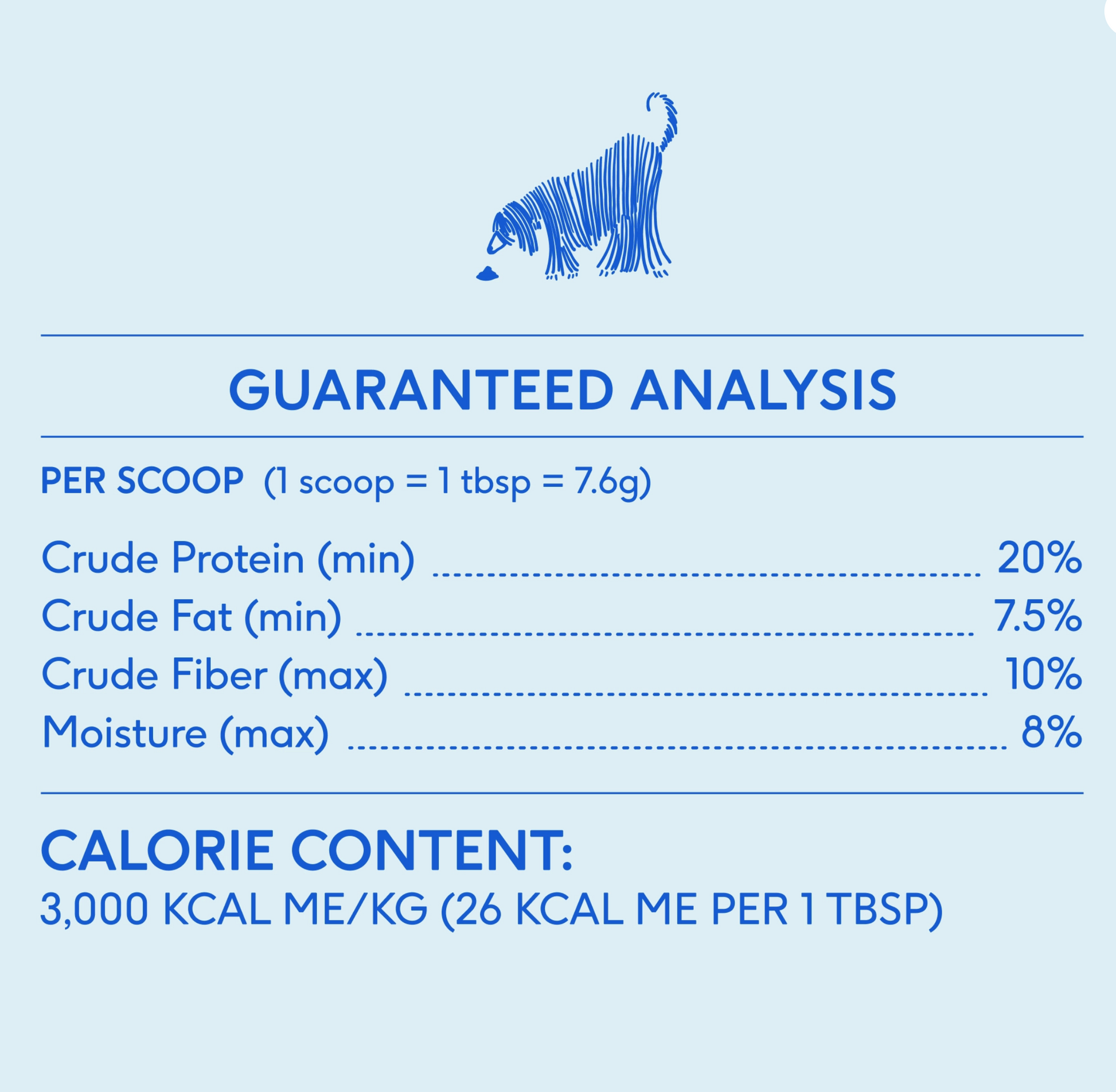 Our Pumpkin is anything but basic. Our tummy-regulating, Organic Pumpkin powder contains high-fiber pumpkin seed. Plus, it's formulated with the right fiber to protein ratio to support good gut health. That means your pup can say goodbye to diarrhea, loose stools, and tummy troubles with our full-of-fiber, vet-formulated recipe. Solid poops only, please!