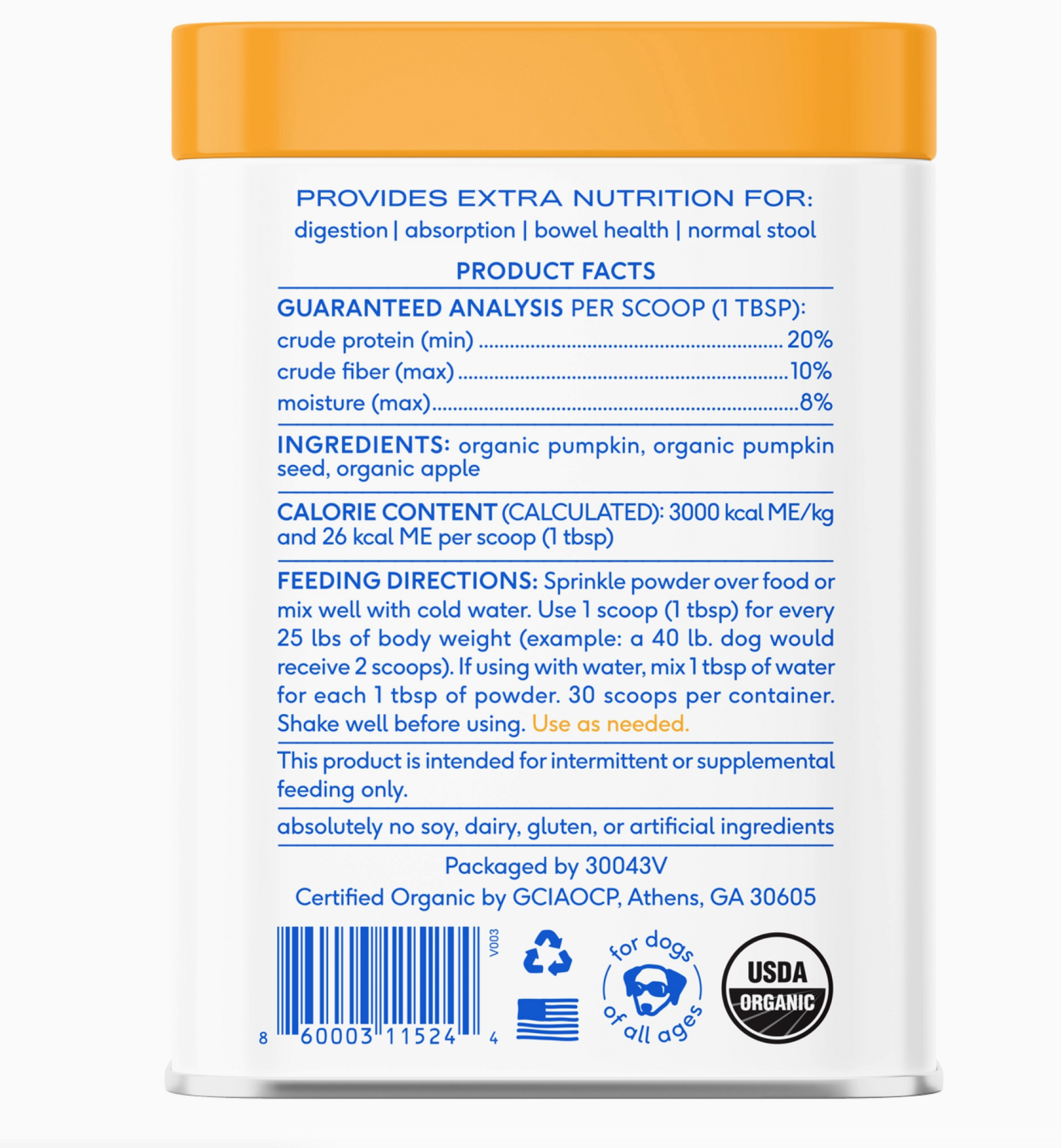 • 3 Key Ingredients: organic pumpkin, organic pumpkin seed, and organic apple provide gentle relief for digestion, absorption, bowel health, and normal stool