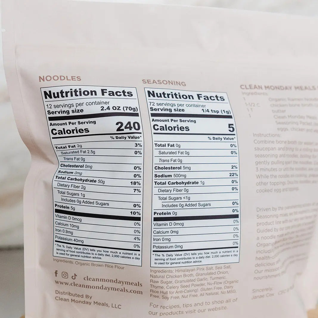 Inspired by the success of our Ramen Seasonings, we created our own 12-pack of Organic Brown Rice Flour noodles ($2.33/meal). Perfect for those with food allergies, restrictions, or just wanting a cleaner option. We fixed common issues: 1) Resealable Bag – no more dried-out noodles; 2) Individually Sealed Cakes – prevents breakage and keeps noodles fresh; 3) Attached Seasoning Packets – each cake comes with its own Chicken Ramen Seasoning on top for easy grab-and-go without digging through the bag. Our mission remains the same: bring hope and nourishment through inclusive, allergy-friendly food.