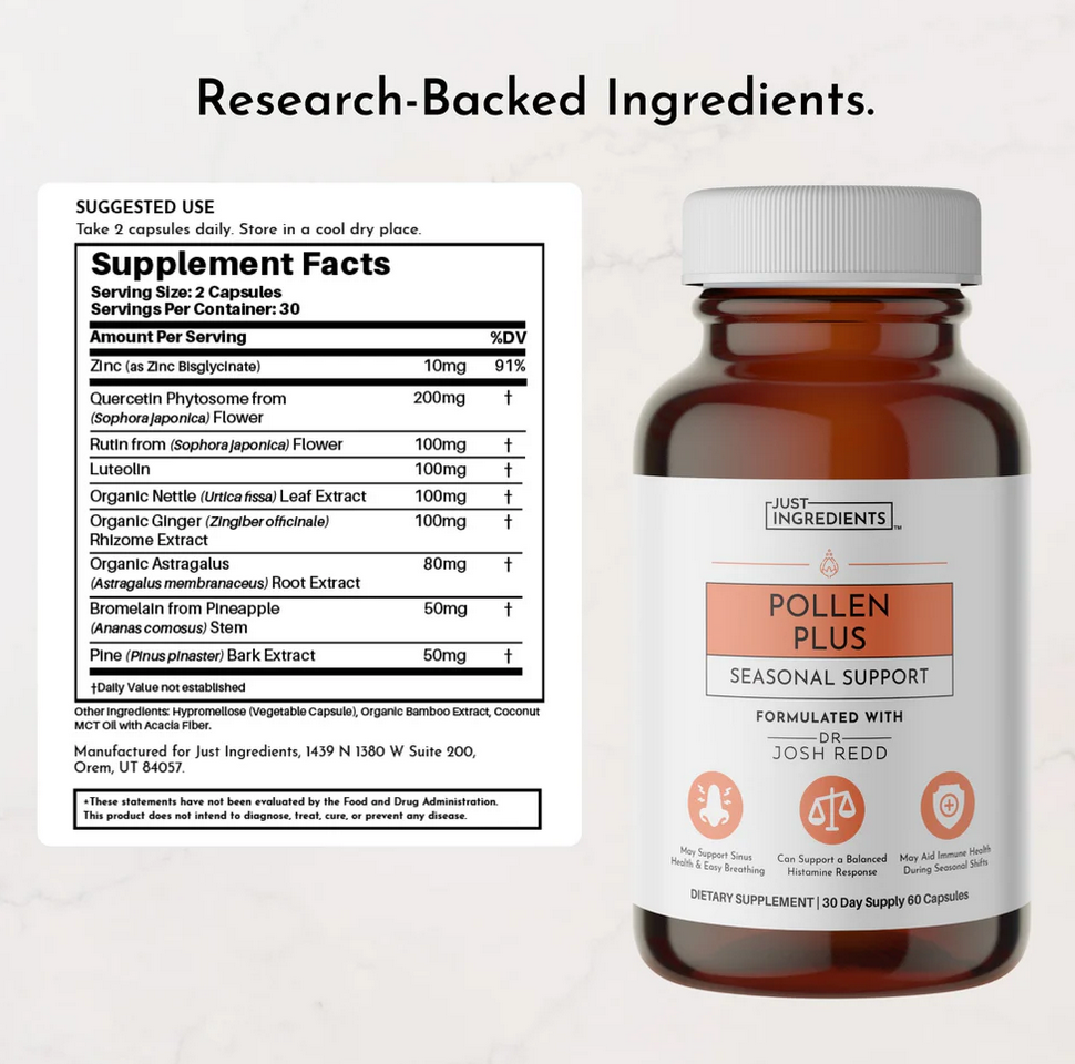When the seasons shift, reach for Pollen Plus to help support your body’s defenses.* We included bioavailable zinc bisglycinate to support a normal inflammatory response, quercetin phytosome to help protect cells from oxidative stress, and bromelain, which may help support quercetin absorption. We’ve also added astragalus, nettle, ginger, rutin, and pine bark for more antioxidant support and additional wellness benefits.