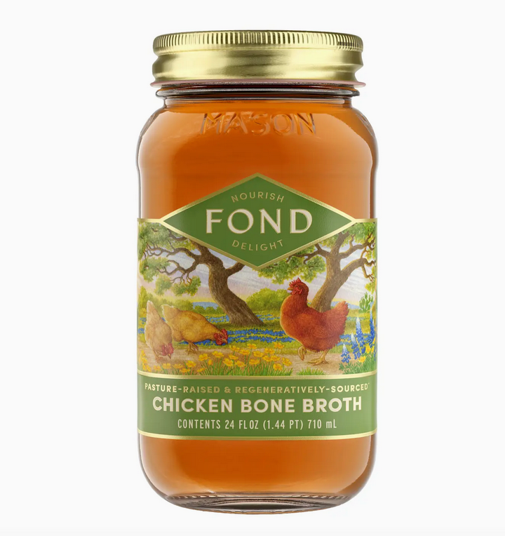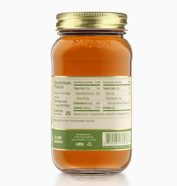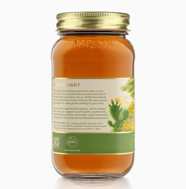 FOND is the only certified Regenerative Bone Broth on the market. We are Land to Market certified and only use pasture raised, regeneratively-sourced, bones to produce our delicious chicken bone broth. It is simple only made from just bones, water, and salt. No added flavor from vegetables, herbs, or spices so you can add this to any and all recipes.