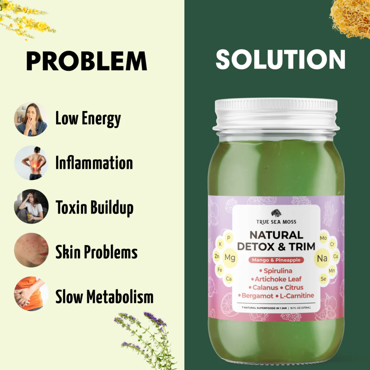 Natural Detox & Trim Sea Moss Gel is a powerful blend of wildcrafted sea moss and a range of nutrient-dense botanicals designed to support detoxification, weight management, and overall well-being.