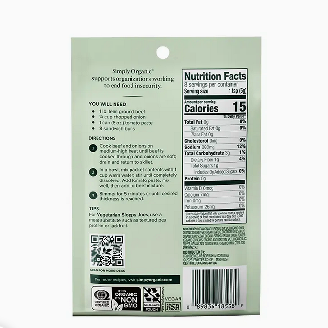 Simply Organic® Sloppy Joe Seasoning Mix delivers bold, savory flavor with a blend of organic onion, garlic, paprika, and chili pepper. This mix offers a satisfying take on a nostalgic favorite, made with uncompromising organic ingredients and no artificial flavors or preservatives.