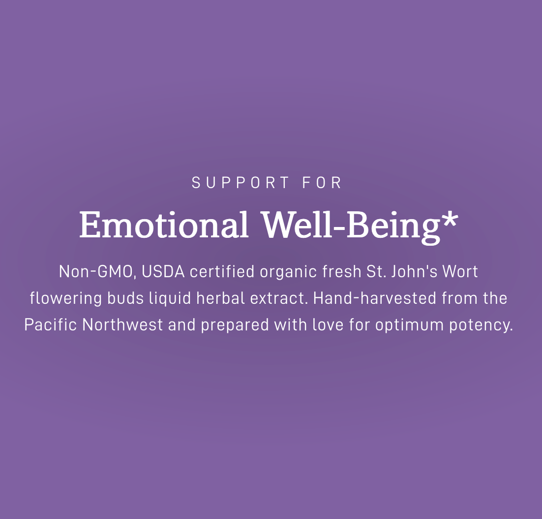 Non-GMO, USDA certified organic fresh St. John's Wort flowering buds liquid herbal extract. Hand-harvested from the Pacific Northwest and prepared with love for optimum potency.